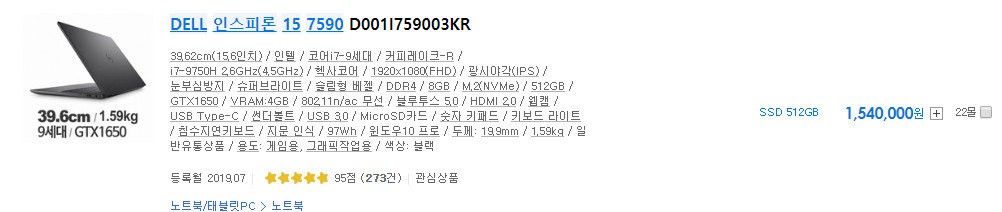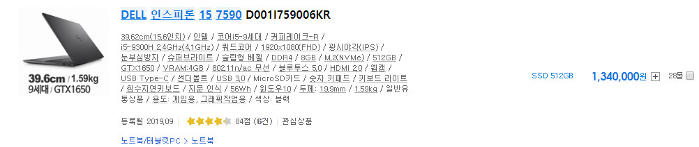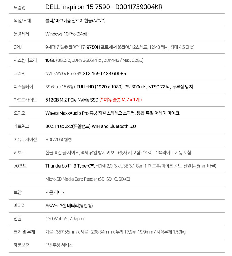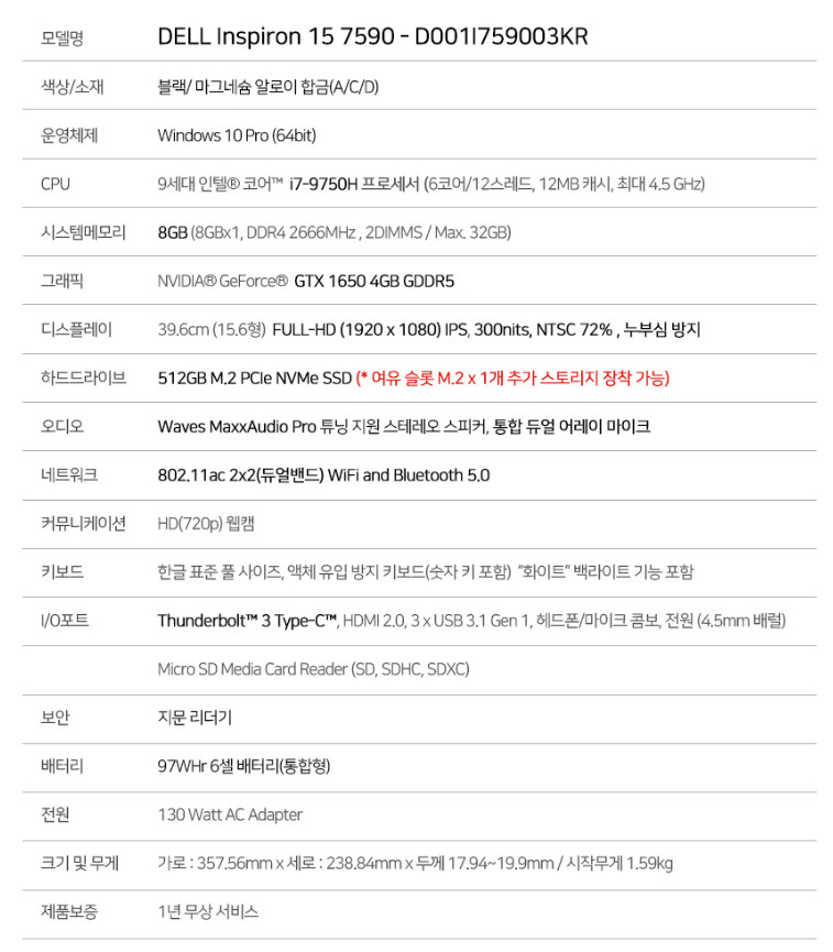 자 여기서 델의 정말 치사한 꼼수가 나옵니다. 델이 이 부분에서 어떠한 스탠스를 취하고 있는지 보시면 놀랍습니다. 그냥 무게가 1.59kg라고 한 것이 아닌 시작무게를 1.59kg라고 기재했죠. 이게 뭘 뜻하냐면 델 인스피론 7590은 3셀의 56Wh 배터리이고 그렇기 때문에 1.59kg이 맞다. 하지만 너희들이 고른 노트북은 6셀의 97Wh이다. 쉽게 말해서 6셀의 97Wh의 배터리를 옵션 처리 한 거죠. 그래서 여기 "시작무게 1.59kg"라고 표시 한 겁니다. 참고로 방금 말씀드린 내용은 델의 입장이 아닌 제가 분석한 부분인데 이게 맞을 확률이 높아요. 이게 지금 실수로 넣은 제원이 아니고, 얘네들은 실제로 1.59kg의 노트북이라고 생각하고 있는 거죠. 세상에 이런 꼼수가 어디 있어요.