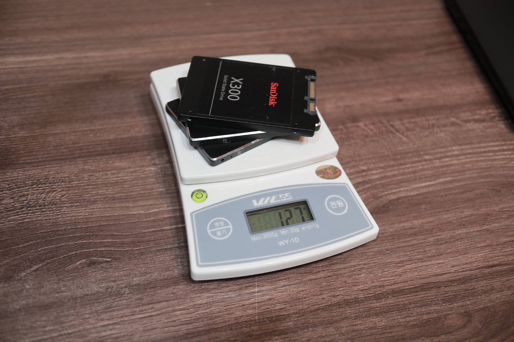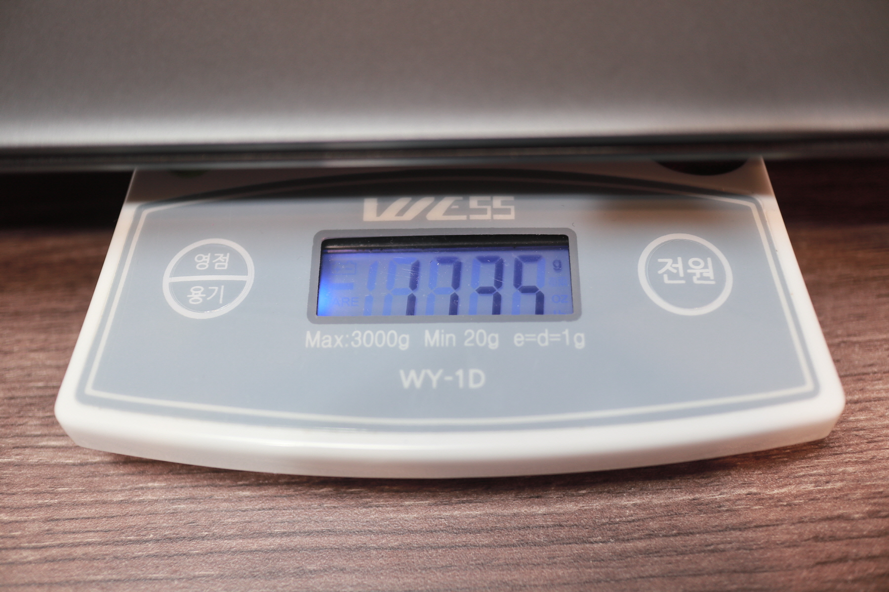97Wh가 들어간 이 노트북 무게를 1.59kg으로 알고 구매하시는 분들이 많을 것으로 생각합니다. 하지만 제가 개봉하고 드는 순간 1.59kg까지는 아니라고 바로 느꼈습니다. 직접 재 보니 1.73kg 나왔습니다. 140g 차이입니다. 이 노트북이 지금 초기 상태에서 램만 하나 추가 되었는데 램은 무게가 얼마 나가지 않고, 140g 차이는 노트북에서 꽤 큰 차이입니다. 2.5인치 SSD를 3개 합쳐도 140g이 안됩니다.