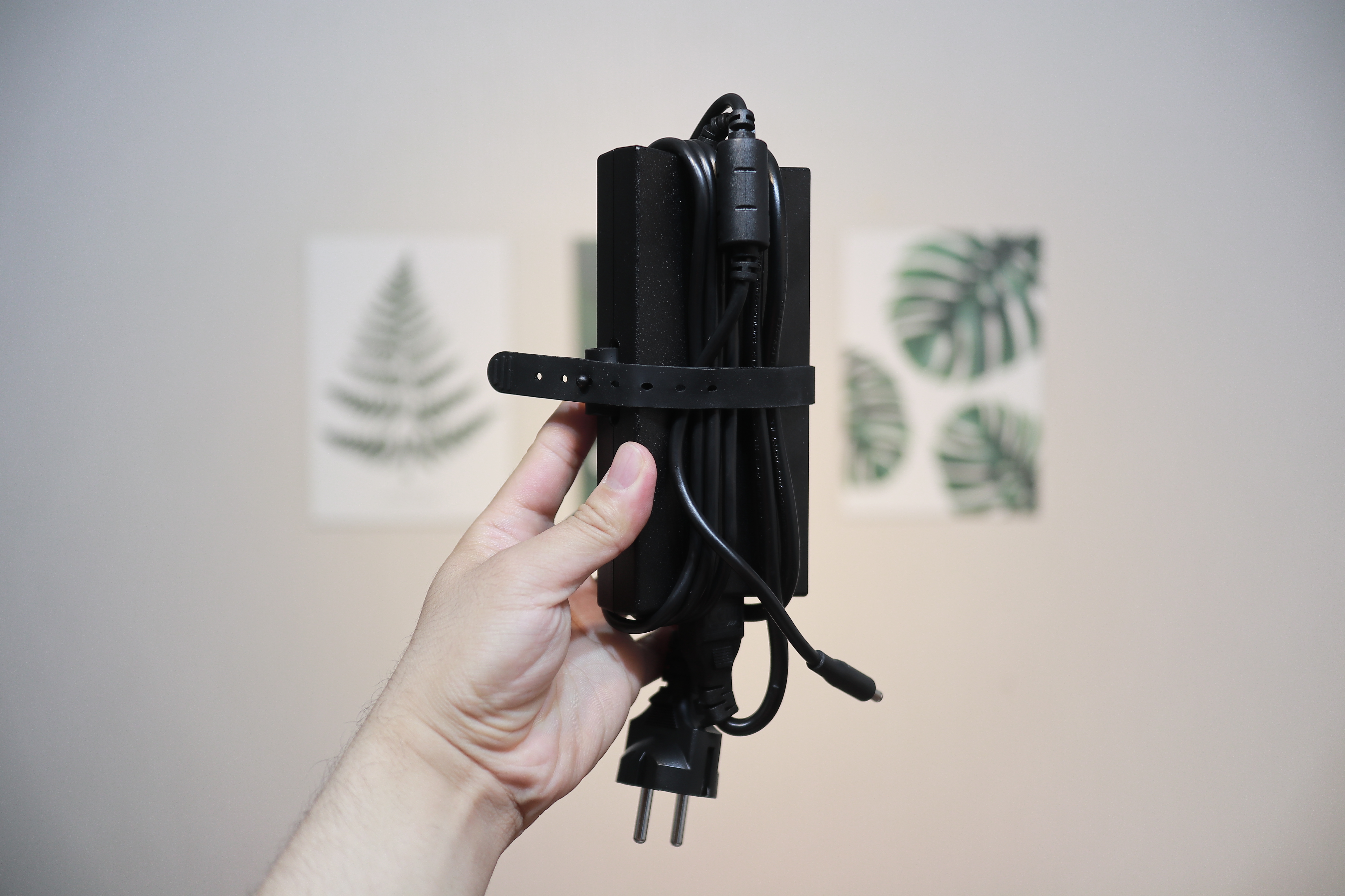어댑터는 130W로 일반적인 고성능 노트북 어댑터 수준이고 어댑터의 사이즈는 절대 작은 사이즈는 아니지만 얇은 편 이긴 합니다. 델 어댑터는 항상 이렇게 선 정리 할 수 있는 고무 밴드를 어댑터에 결속시켜 주고, LED도 하나 넣어 줍니다. 이런 세심한 부분을 항상 잘 지켜주더라고요.