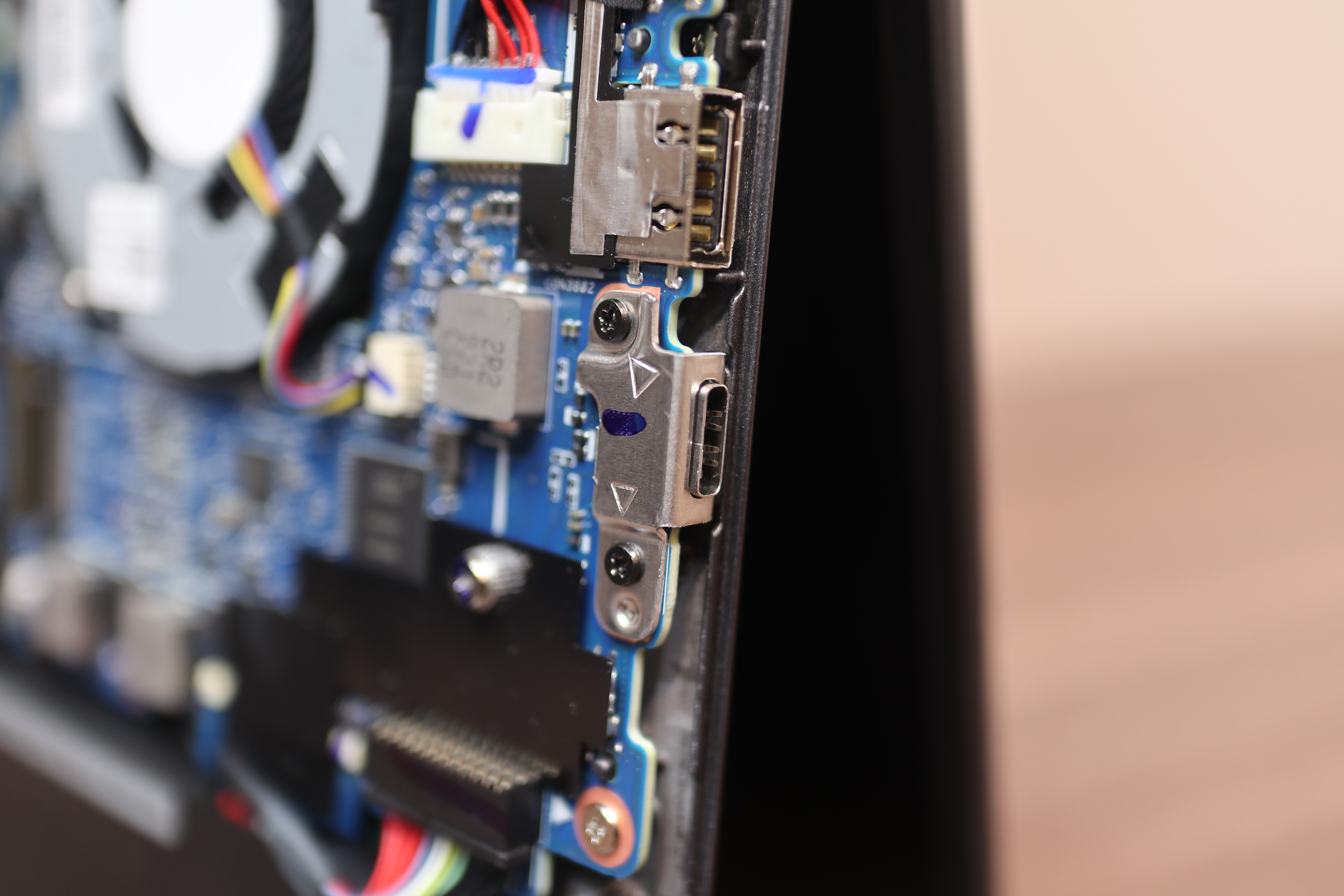제가 항상 강조하는 포트 내구성을 보겠습니다. 제가 항상 언급해왔기 때문에 필요성에 대해서는 더이상 말씀드리지는 않겠습니다. 가장 많이 사용하는 전원과 썬더볼트 단자를 강철이 잘 감싸고 있습니다. 썬더볼트에 물려있는 강철이 조금 얇아 보이긴 하지만 그래도 이정도면 훌륭하죠. USB와 HDMI단자는 좀 허술해 보이지만 전원과 썬더볼트의 보강만으로 충분히 높은 점수를 줄 수 있습니다.