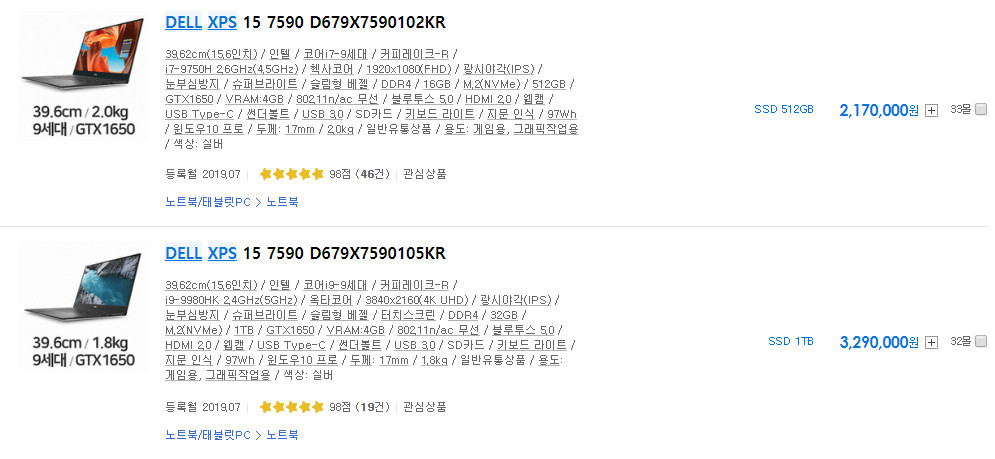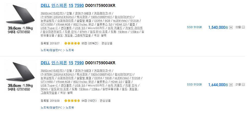 저는 i7-9750H 모델로 150만원 정도에 구매했습니다.