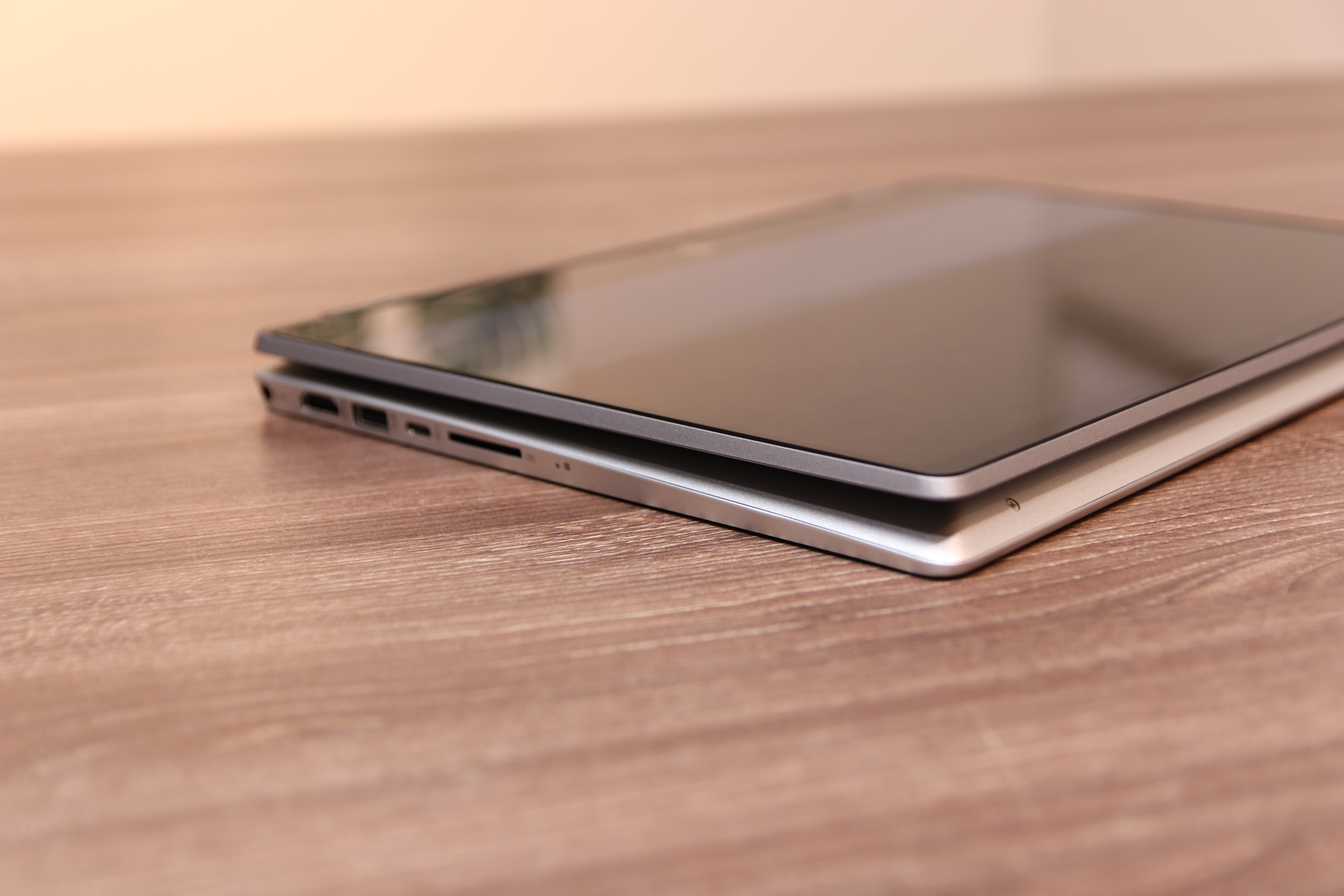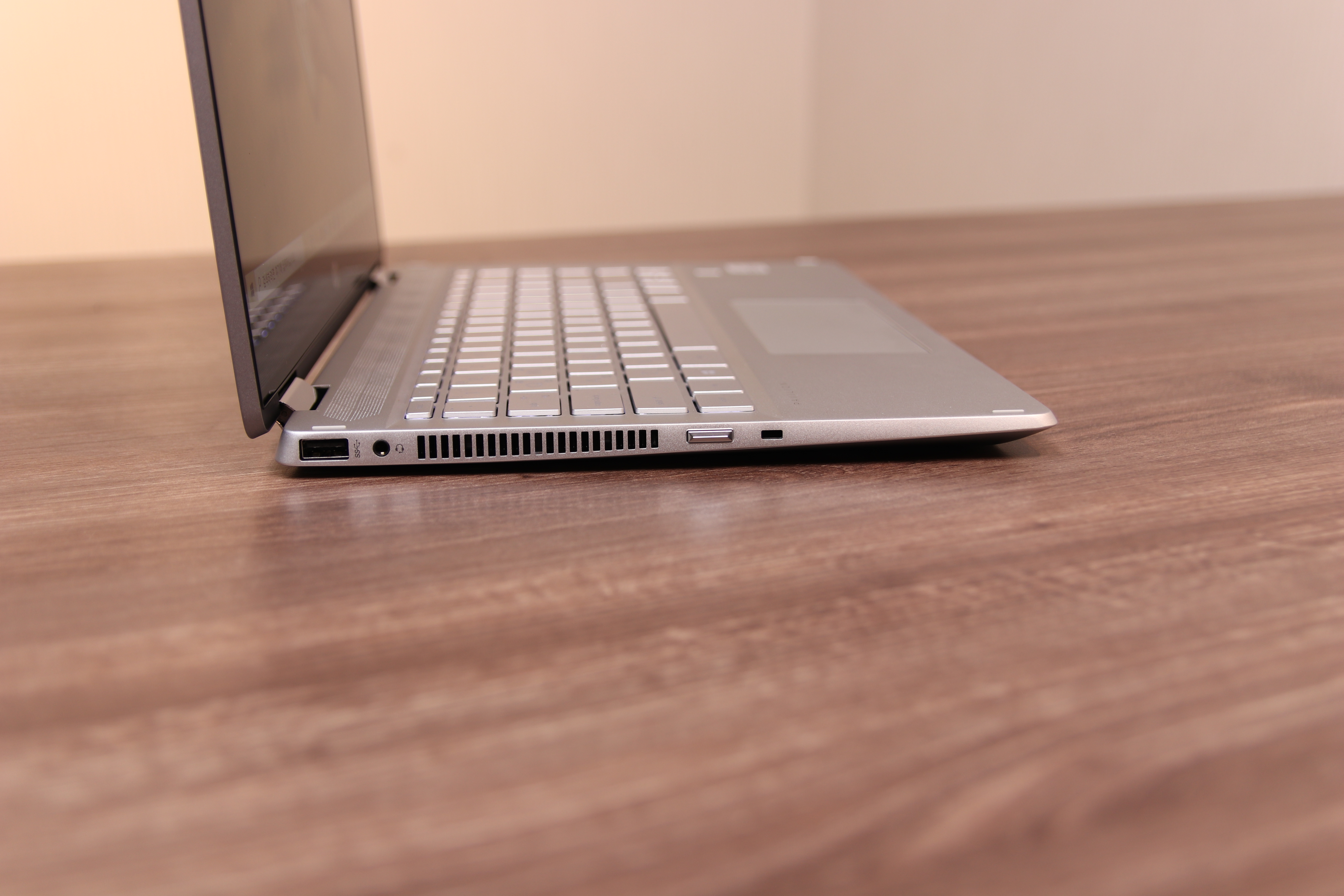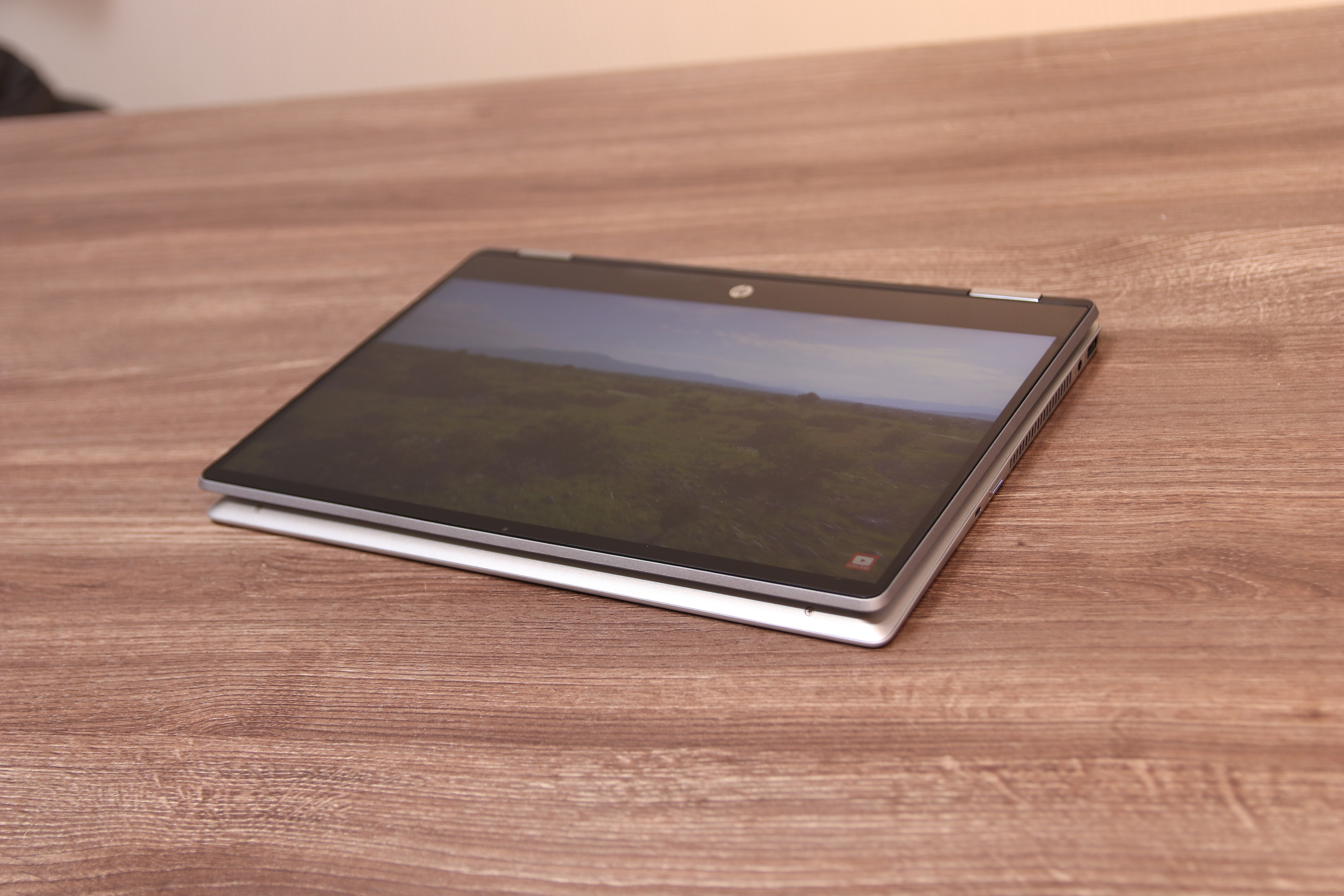 2in1스럽지 않은 디자인으로 전체 플라스틱이지만 회색에 펄이 들어간 도료와 크롬도금의 조합으로 메탈 느낌 나는 듯한 착각을 일으키는 디자인입니다. 이 다음 리뷰에서 자세히 언급하겠지만 저는 개인적으로 HP 노트북은 특유의 뚱뚱한 디자인은 마음에 들지 않지만 HP 브랜드 색상인 회색을 사용하는데 있어서 촌스럽지 않고 세련되게 잘 사용한다고 생각합니다. 사실 크롬도금도 어떻게 보면 촌스러울 수 있는데 회색과의 조화가 굉장히 좋습니다.