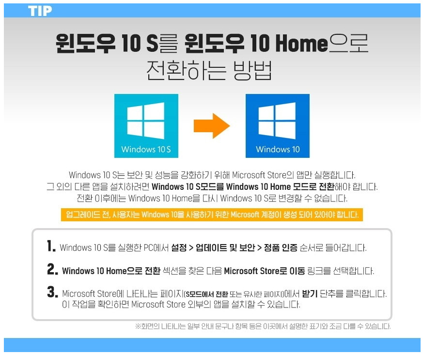 윈도우10S는 윈도우10 Home으로 쉽게 무료변경 가능합니다.