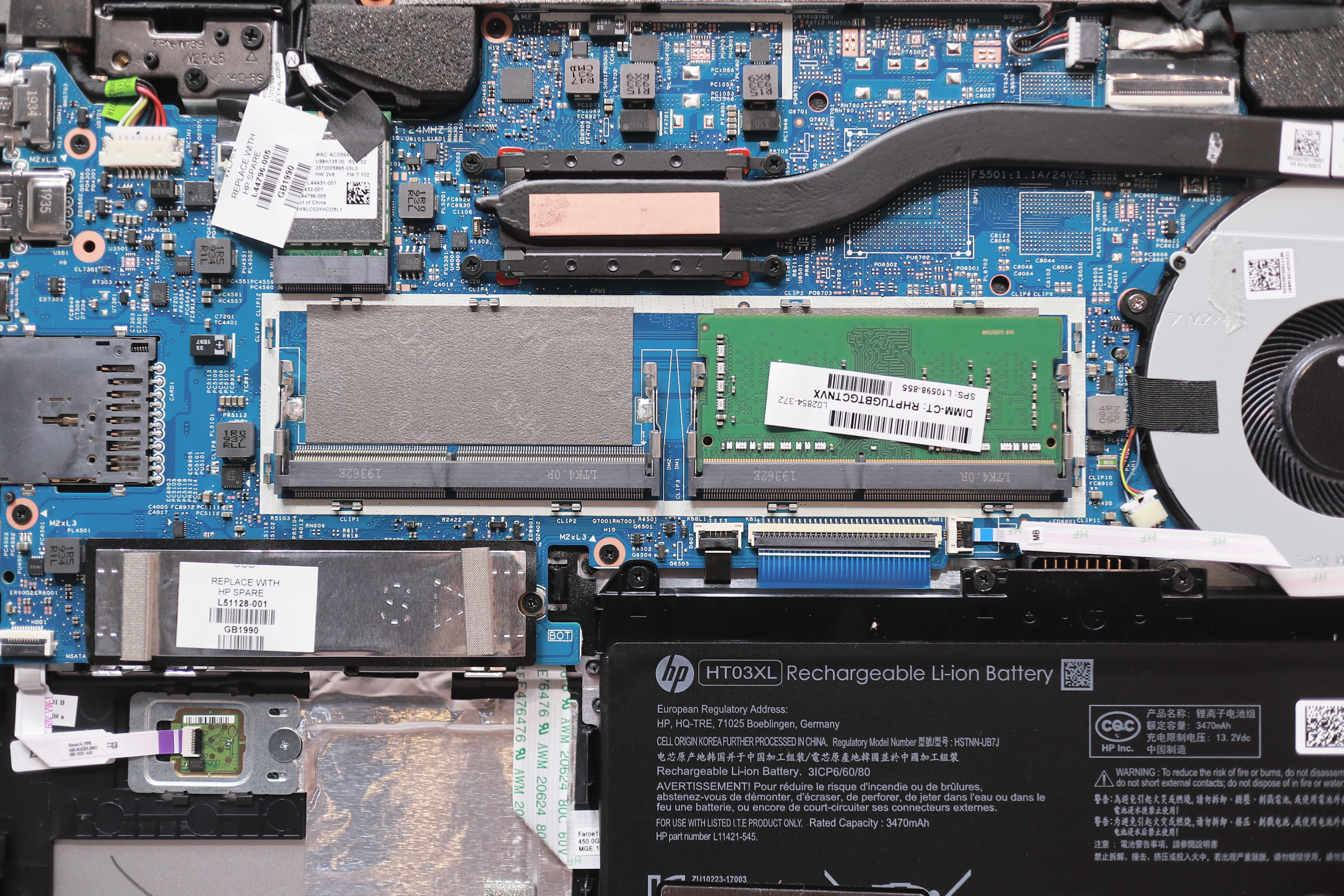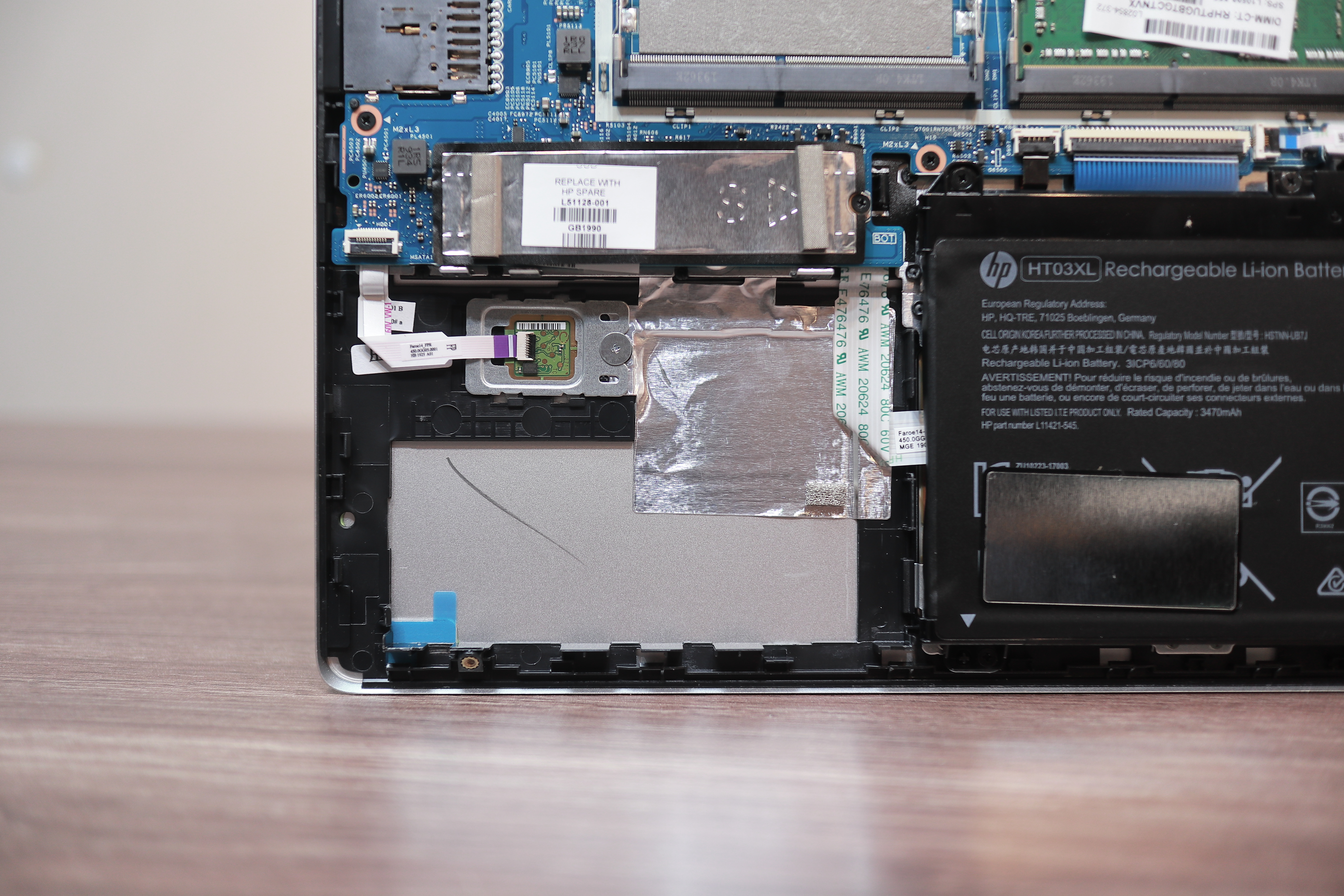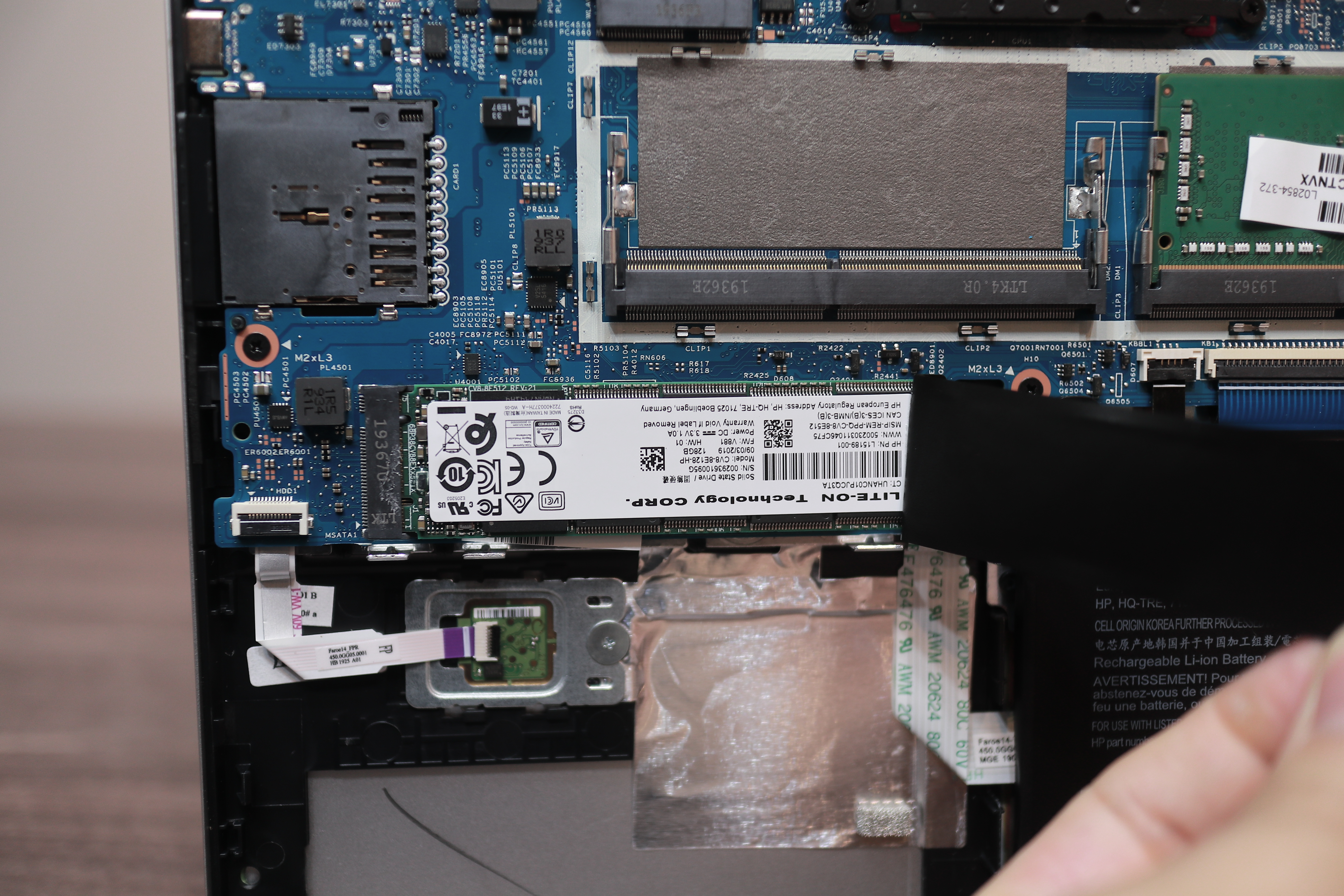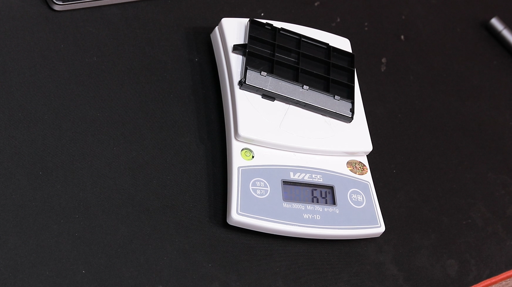 그리고 눈에 띄는 부분이 2.5인치 디스크 공간에 플라스틱 부품이 하나 들어있는데, 보통 이렇게 들어있는 노트북들 있어요. 그런데 여기 보시면 꽤 묵직한 납이 들어있습니다. 그래서 제가 무게를 재어보니 63g이 나가더라고요. 2.5인치 SSD보다 더 무거운 무게추가 들어 있는 거죠. 여기서 여러분들이 아셔야 할 부분은 이게 필요하기 때문에 들어갔다는 겁니다. 배터리가 오른쪽으로 치우쳐 있기 때문에 전체적인 무게 밸런스를 맞추기 위해 이 쓸데없어 보이는 플라스틱과 납덩어리가 들어간 거죠. 이 부분을 공학적으로 접근해 보면 이 납이 들어감으로써 노트북 전체 무게 밸런스가 잡히고, 실제로는 전체 무게 63g이 추가 되었지만 막상 들어보면 균형있는 하중으로 인해 더 가볍게 느껴지기도 합니다. 아무래도 한쪽으로 쏠리면 더 무겁게 느껴지죠. 그리고 이 무게 밸런스는 노트북을 떨어트렸을 때 균등한 하중 분배로 연결되고 충격을 더 효율적으로 흡수합니다. 한마디로 비용과 무게를 추가시키면서까지 이것을 넣은 이유가 있다는 거죠. 방금 제가 한 말은 노트북의 공학적 접근이고 사실 있으나 없으나 상관없어요. 가벼운 노트북이 장땡이면 제거해도 됩니다.