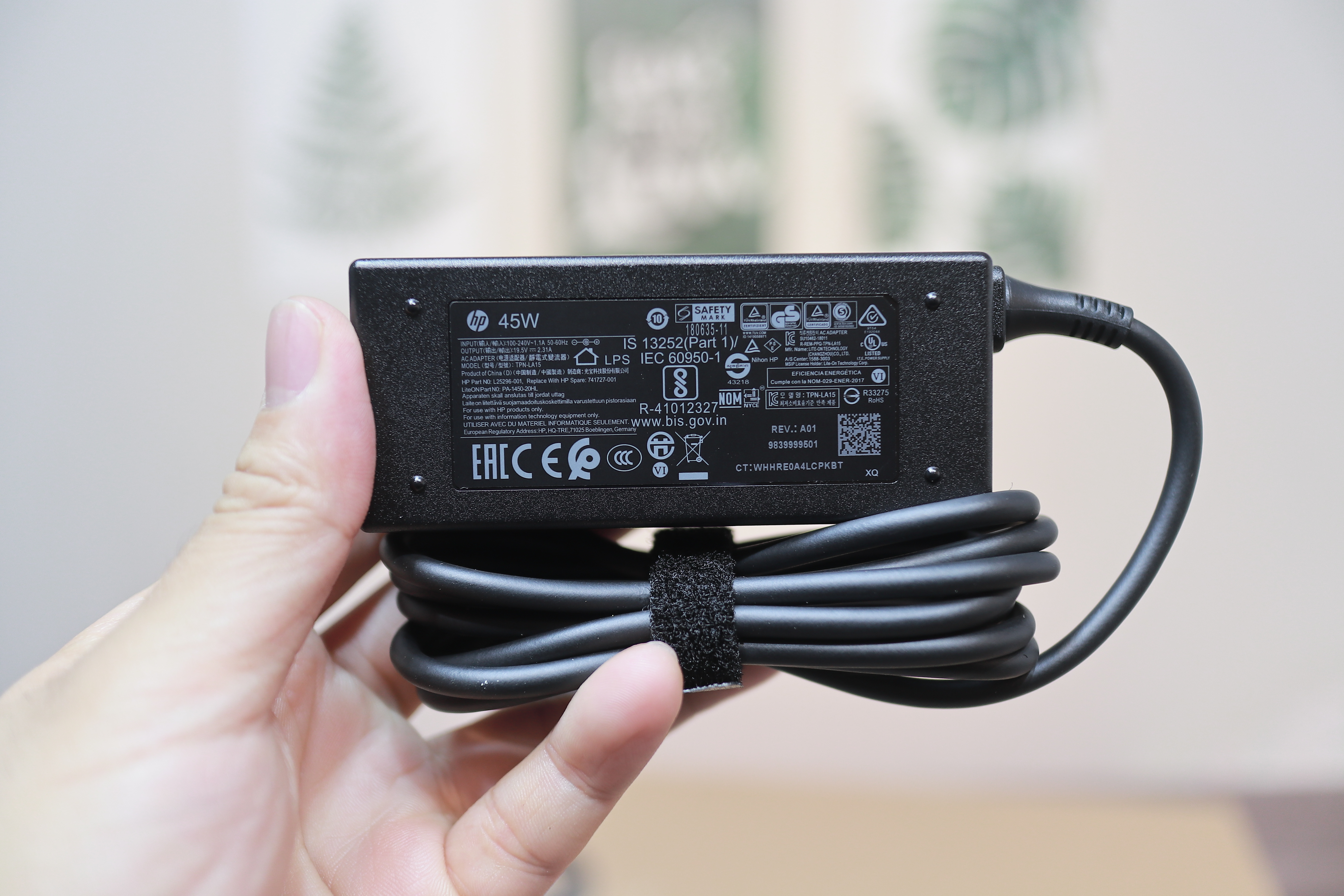충전기는 보급형에 알맞은 구형 충전기입니다. 이게 원가가 가장 저렴해서 보급형의 단골 충전기죠. 45W입니다. 참고로 저는 이렇게 HP 호환 일체형 충전기 항상 가지고 있어요. 제가 항상 뭔가를 보여드리면 따라 구매하시는 분들이 많아져서 간단하게 설명을 해드리겠습니다.