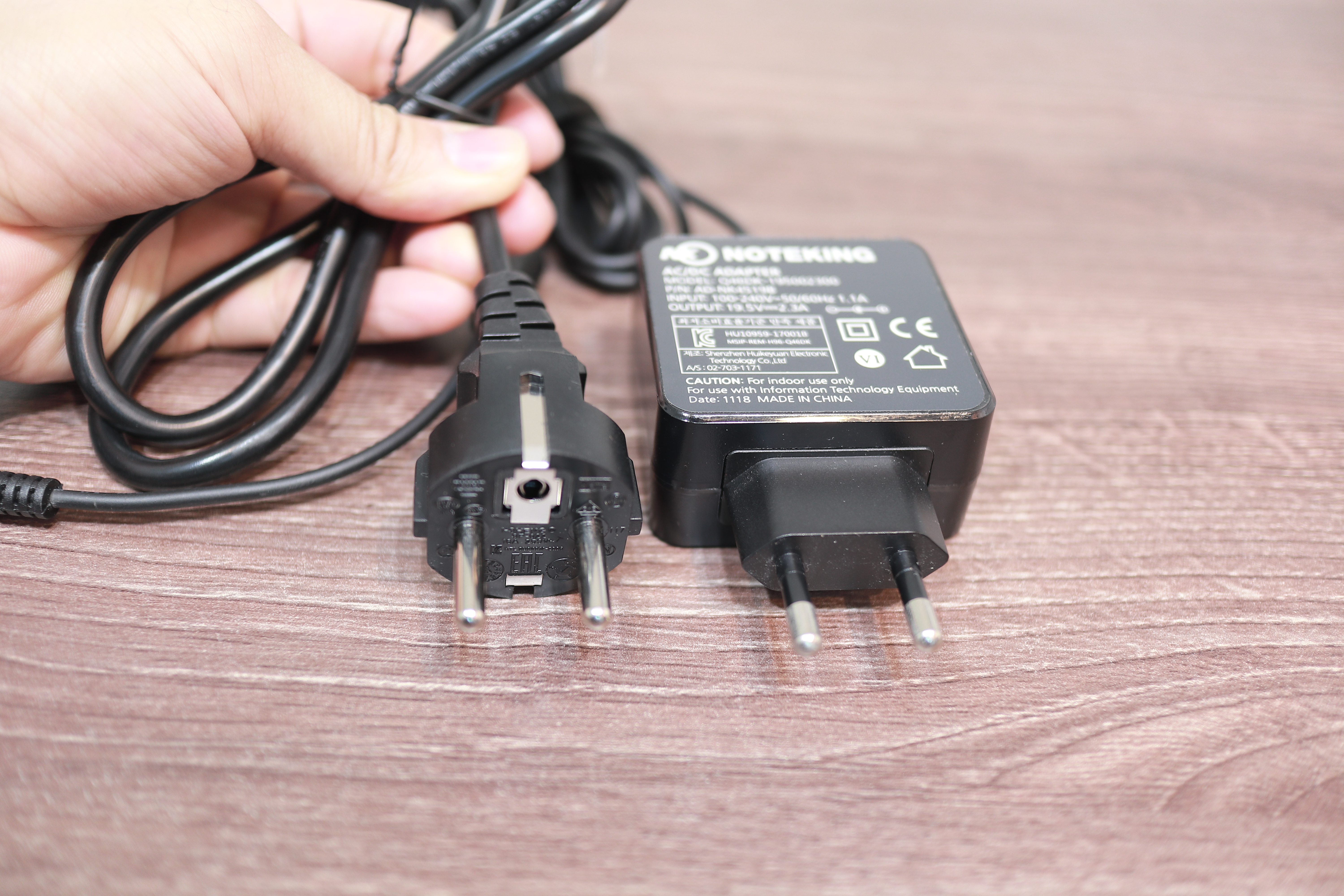 저는 저전력 노트북은 충전기의 휴대성도 굉장히 중요하다고 생각해서, 모든 제조사들의 일체형 충전기를 가지고 있어요. 정품인 것도 있지만 이렇게 저렴한 호환 충전기도 있습니다. 사용해 보신 분들은 아시겠지만 이런 일체형 충전기가 휴대성이 굉장히 좋습니다. 하지만 단점도 있어요. 보시면 이렇게 삼구짜리 전원은 접지가 가능한 반면 일체형 충전기는 접지가 안됩니다. 쉽게 말해서 일체형 충전기를 사용하면 노트북에 전류 흐르는 것이 느껴진다는 거죠. 미세전류라서 저는 크게 신경 쓰지 않지만 예민하신 분들은 불편할 수 있어요. 그럼에도 제가 일체형을 사용하는 이유는 첫 번째 휴대성이고, 두 번째 저는 전류를 손으로 느낄 일이 없어요.