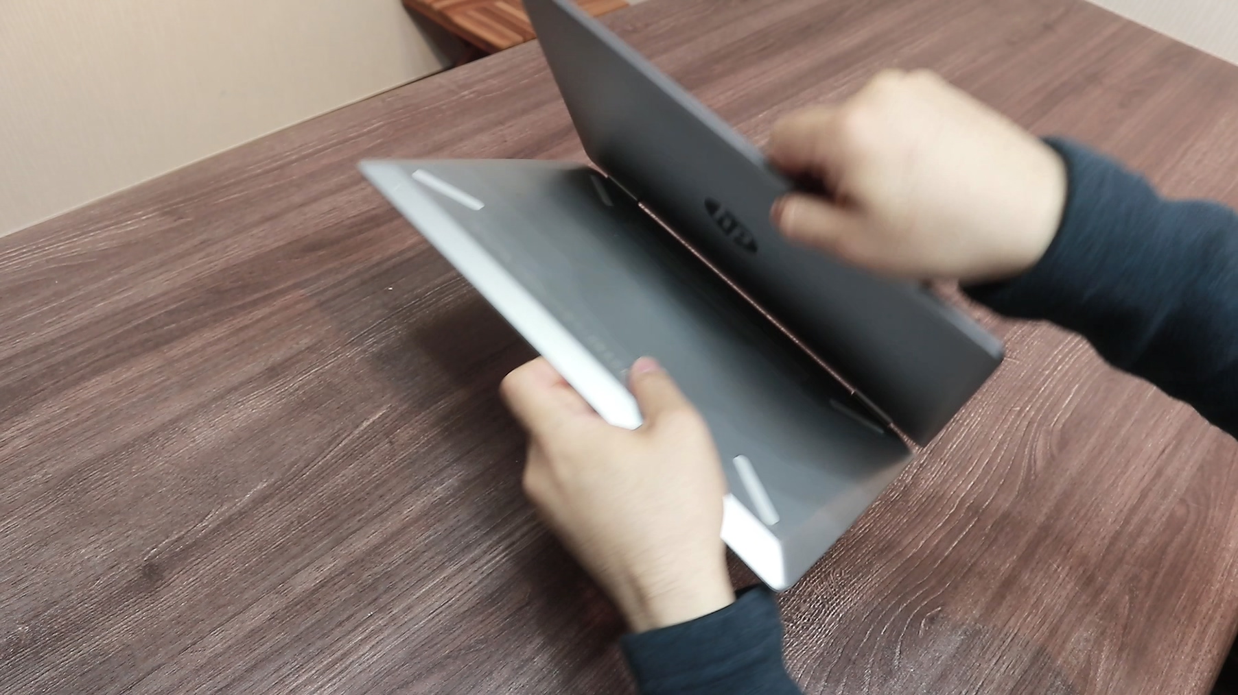 360도 회전 힌지 답게 견고하고 튼튼합니다. 이렇게 힌지에 걸리는 마찰력이 높으면 열기 힘든 것이 당연한데 영상 초반 디자인에 대한 설명에서 말씀드린 것처럼 3면 모두 열기 편한 디자인으로 되어있기 때문에 흰지의 마찰력이 높지만 열고 닫기 편리하고 당연히 360도 회전 할 때도 굉장히 편리합니다. 사용성은 굉장히 좋습니다.