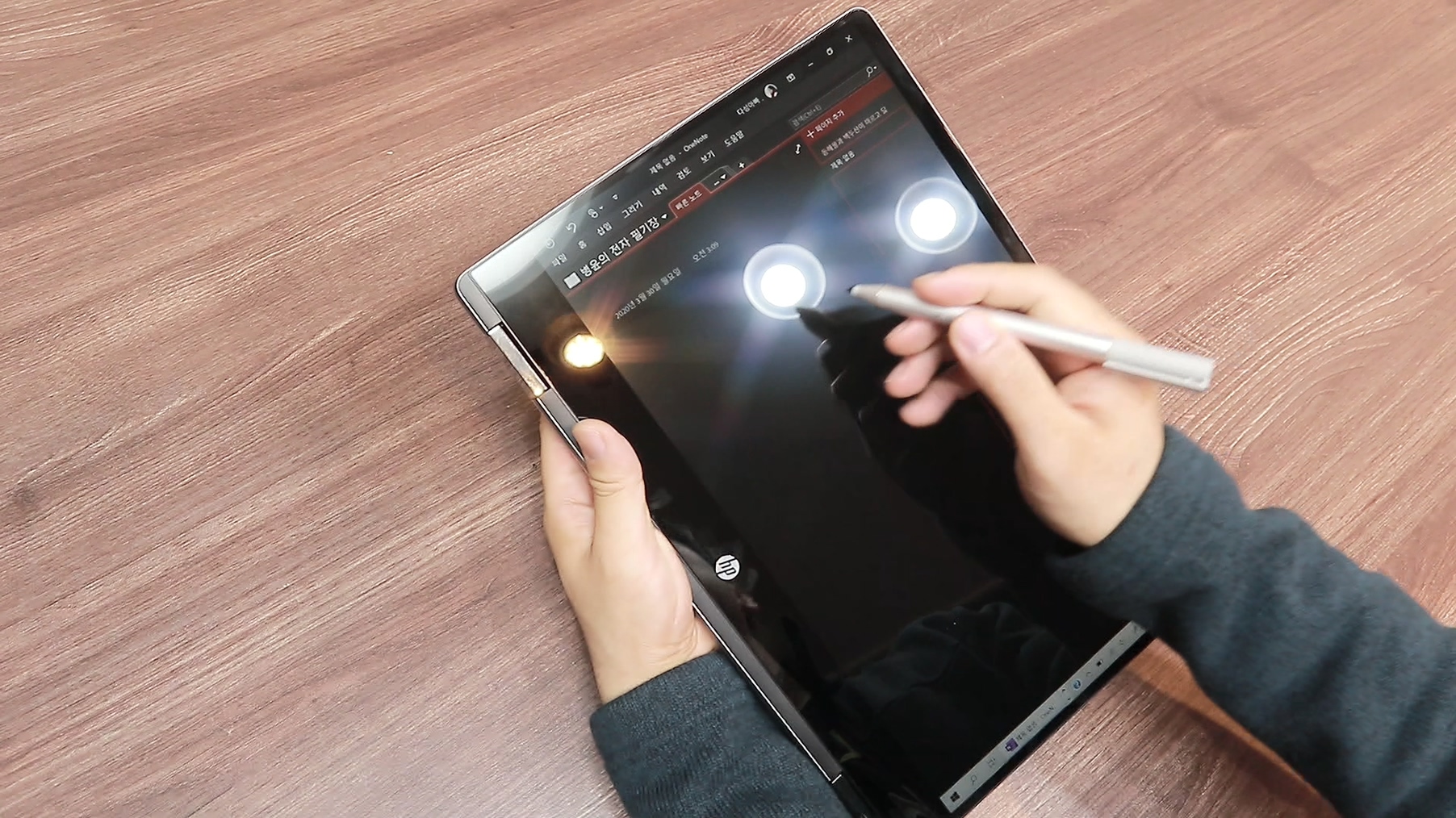그리고 2in1 노트북을 리뷰할 때 마다 지적하는 내용으로 역시나 글레어 패널로 인해 사용성이 떨어지는 느낌을 받습니다. 일반적인 노트북은 글레어 패널 사용해도 디스플레이 각도 조절로 어느정도 해결 할 수 있지만 태블릿 모드를 사용하는 2in1 노트북은 글레어 패널 사용시 빛 반사로 인해 많은 불편함을 겪습니다.