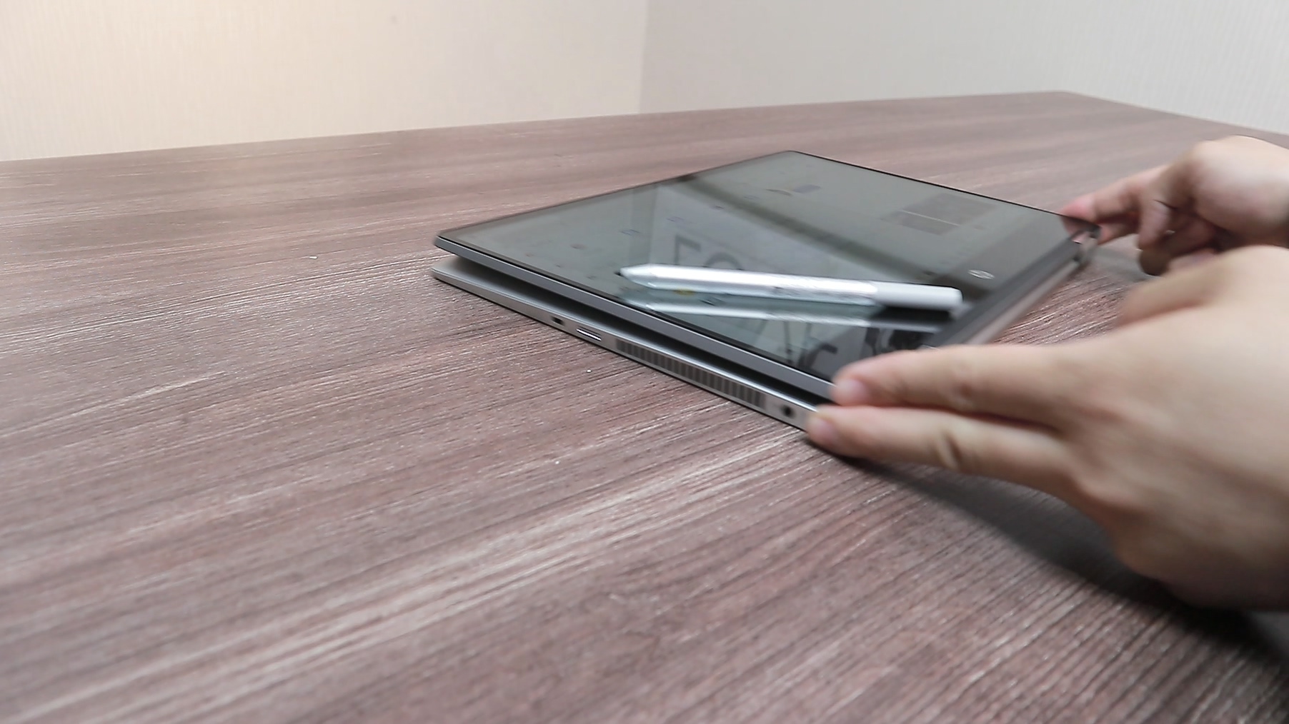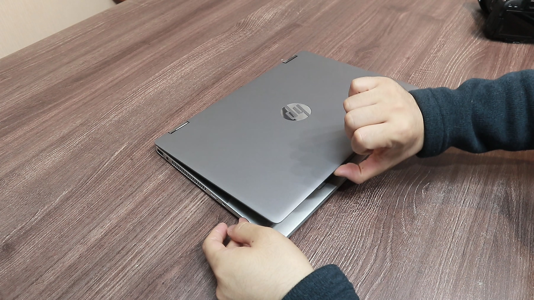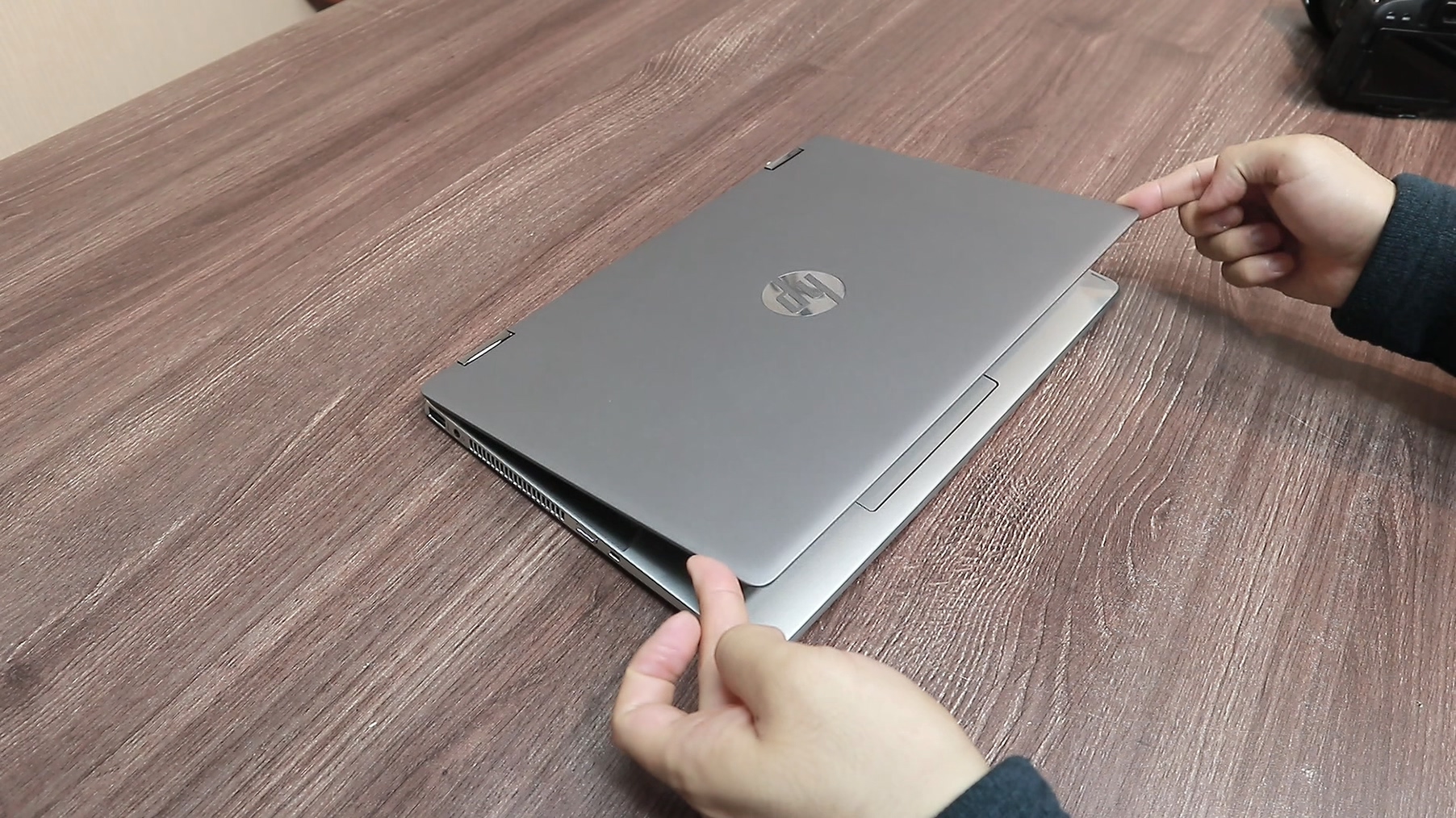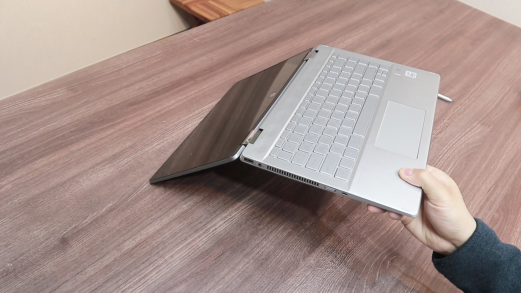 파빌리온 X360의 옆모습입니다. 이 홈부분을 이용해 노트북을 열면 편리하게 열 수 있습니다.