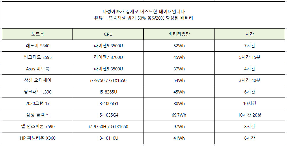화면 밝기 50%, 음량 20%, 유튜브로 24시간 뉴스 연속재생해서 6시간 사용 했습니다. 좋고 나쁘고 할거 없이 41Wh 배터리를 가지면 보통 이정도 사용시간을 갖습니다.