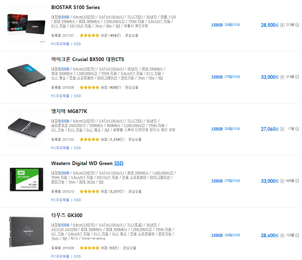 용량은 크면 클수록 좋습니다. 하지만 구형 노트북을 빠르게 업그레이드 한다 해도 서핑용 인강용 수준이기 때문에 기본 프로그램만 담을 수 있도록 저렴한 120GB가 적당합니다. 2020년 4월 기준 가격이 조금 올랐기 때문에 3만원 전후로 구매하시면 좋고, 제가 추천하는 SSD는 링크 걸어 두겠습니다.