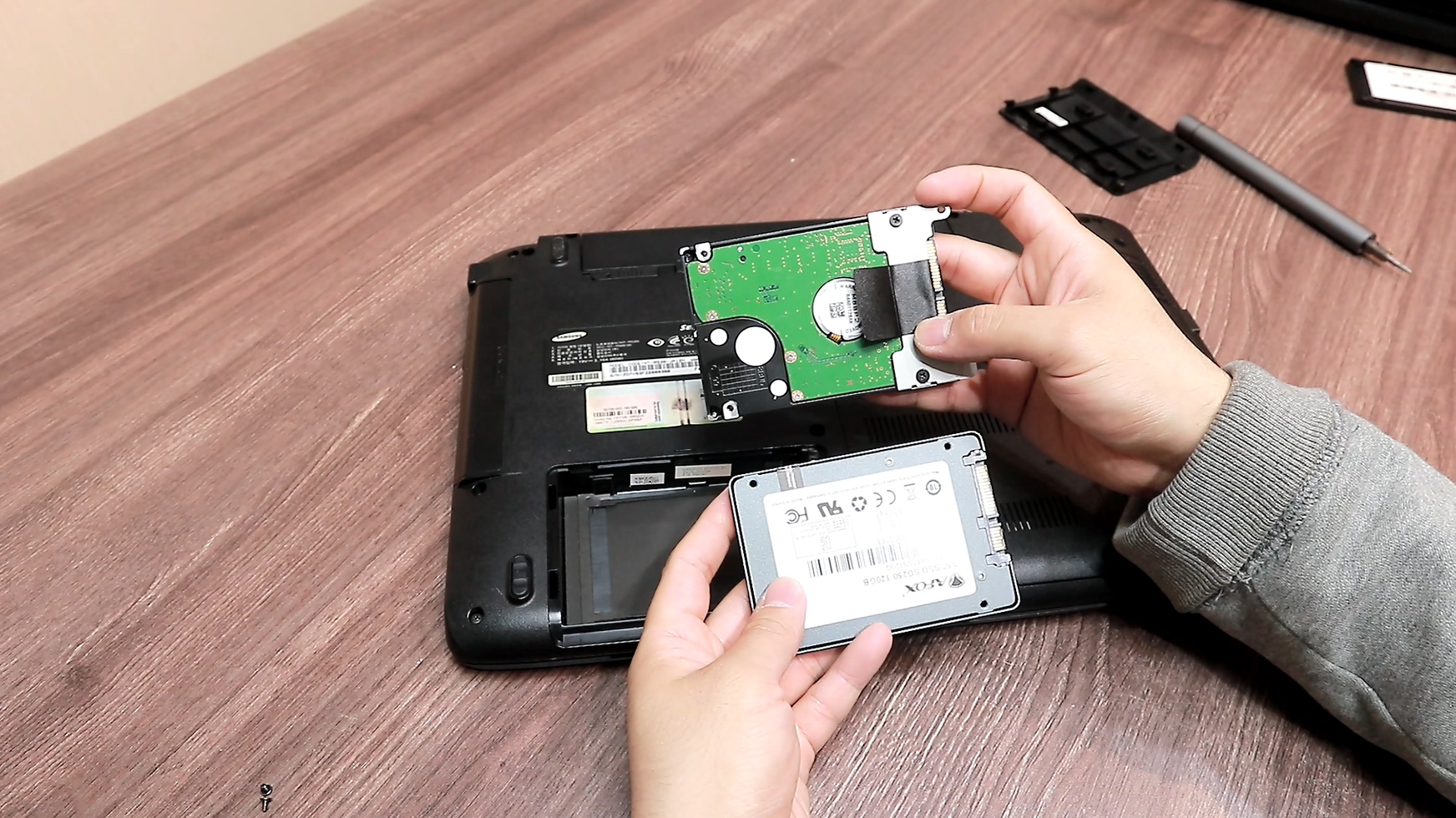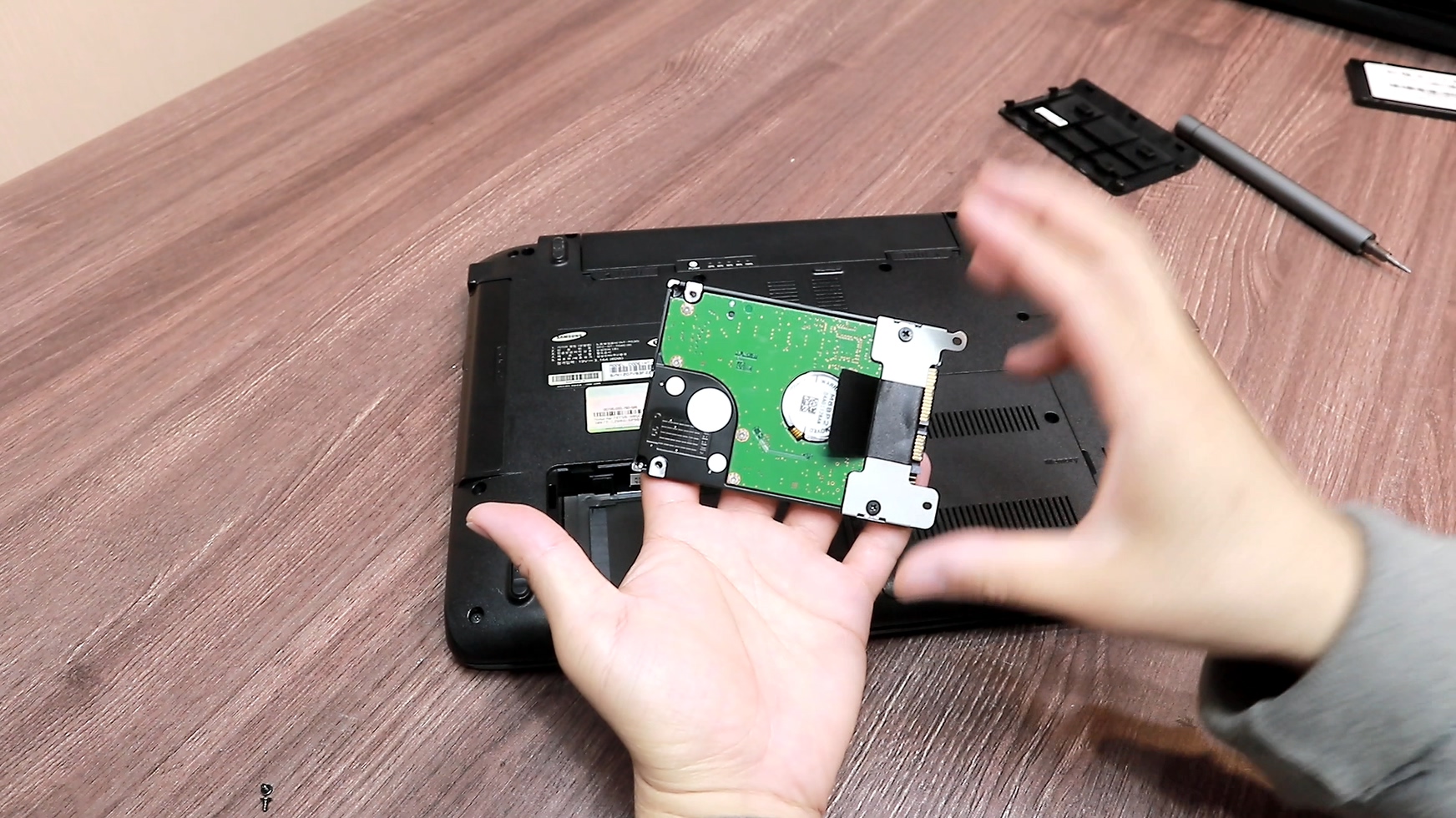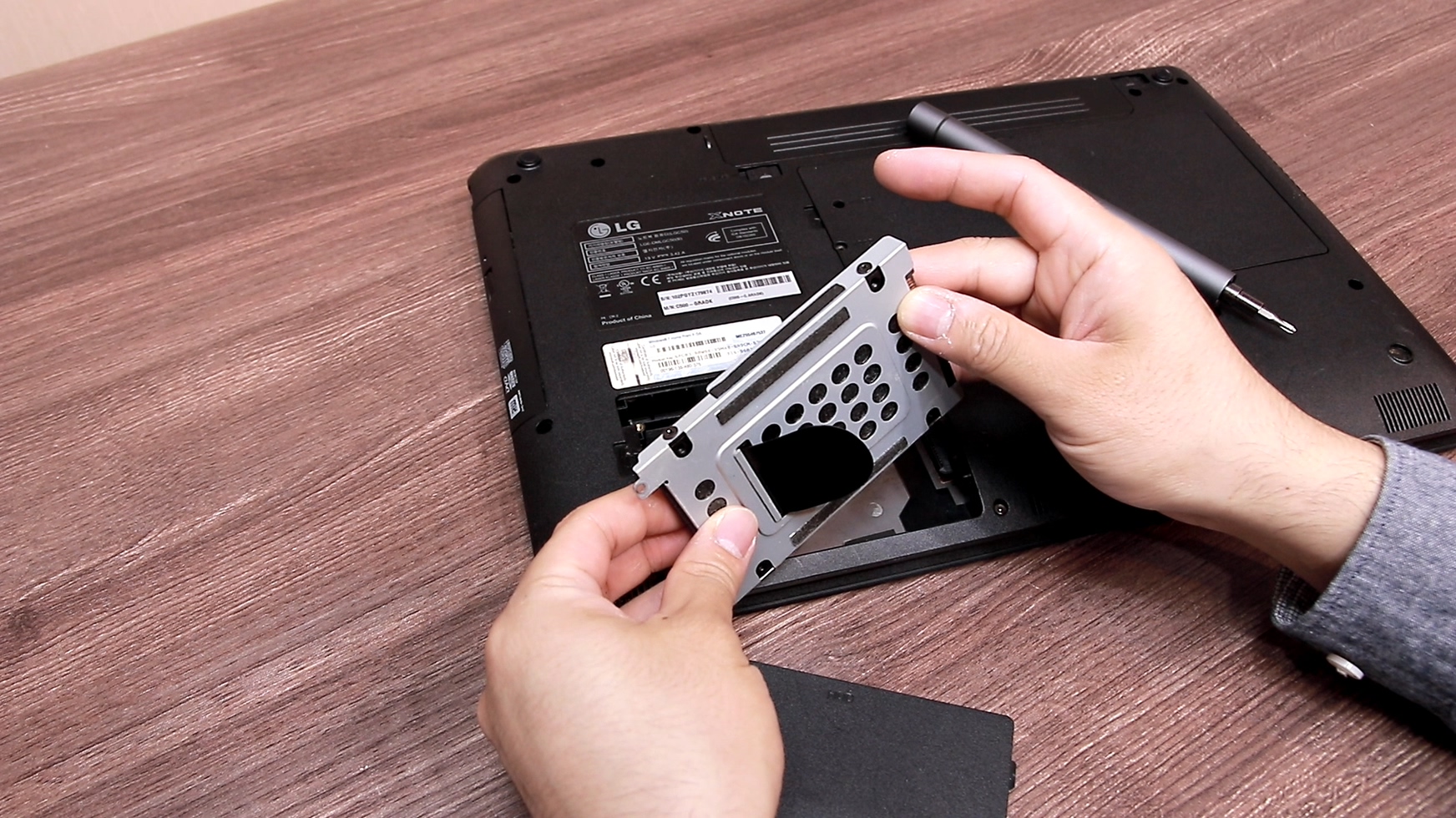 HDD가 들어있는 부분의 나사를 제거해서 HDD를 빼내고 그 자리에 SSD를 넣으면 됩니다. 하판 분해 방법은 노트북 마다 다 다르지만 구형 노트북들은 보통 HDD사이즈의 커버에 HDD표시가 되어있습니다. 요즘 노트북들은 하판 일체형이기 때문에 분해가 까다로운 반면 구형 노트북들은 일체형이 아니기 때문에 초보자들이 접근하기에 훨씬 쉬운 구조를 가졌습니다.
