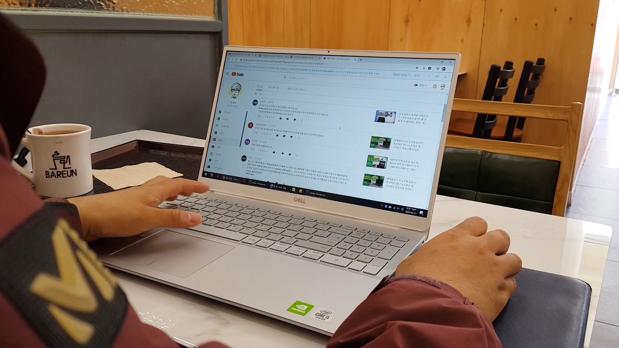 카페를 들고 갔는데, 디스플레이가 생각 보다 너무 어둡더라고요. 제가 항상 방문하는 카페인데 다른 노트북들은 보통 여기서 70% 밝기로 사용합니다. 그램과 플렉스와 같이 디스플레이에 특화 된 제품들은 50%로 사용하기도 합니다. 하지만 델 인스피론 5590은 100% 밝기를 설정 해도 살짝 어둡게 느껴졌어요. 불편하다는 의미는 아닙니다. 100% 놓고 사용하면 나름 괜찮긴합니다. 하지만 100% 밝기의 디스플레이는 배터리 효율이 떨어지기 때문에 저와 같이 휴대성이 중요한 사용자들에게 큰 단점이 되죠.
