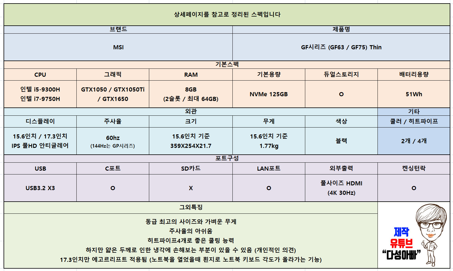 물론 성능의 최적화보다 휴대를 더 중요하게 생각한다면 MSI GF시리즈는 가장 좋은 선택이 될 수 도있습니다.