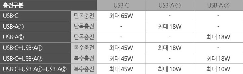 그리고 3개의 포트를 모두 동시에 사용한다면 노트북 충전은 45W로 줄어들고 USB-A타입의 2개의 포트는 각각 10W로 총 출력의 합이 65W가 되는 거죠.