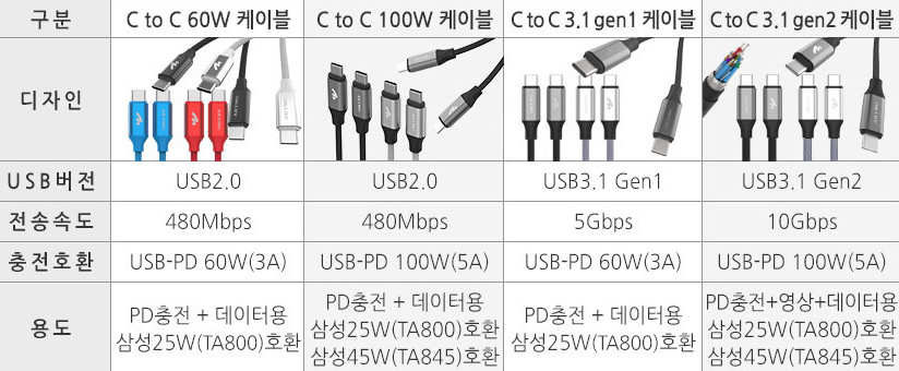 쉽게 말해서 비싼 거 필요 없고, 전송속도 보지 말고 100W 지원 케이블 사면 됩니다.