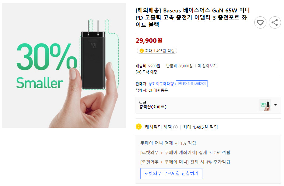 직구 상품 중에서는 부피 작고 멀티충전 가능한 베이스어스 제품이 좋습니다. 제가 남긴 링크로 들어가시면 샤오미 충전기라고 되어있는데, 요즘은 그냥 다 샤오미 이름 막 갖다 사용하더라고요. 65W 멀티 충전기 중에서 가장 작은 사이즈로 국내 사용자들의 평가도 좋습니다. 110V이기 때문에 어댑터를 사용해야 되고 케이블을 따로 구매해야 된다는 단점이 있지만 휴대성이 거의 스마트폰 충전기 수준이고 총 3개의 멀티 충전이 가능하기 때문에 사용성도 좋습니다.