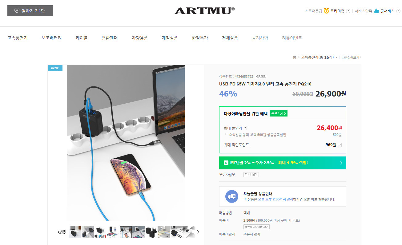 아트뮤의 65W PD충전기의 종류가 2개 있는데, 포트 구성의 차이이므로 관심있는 분들만 체크하시고, 전반적으로 그렇게 훌륭하게 좋은 충전기는 아니지만 할인 된 가격을 고려하면 충분히 매력적인 충전기라고 생각합니다. 저는 충전기 PQ210과 100W케이블 1.2m 2개 해서 33,000원 배송비 포함하면 약 35,000원에 구매했으니 참고하세요.