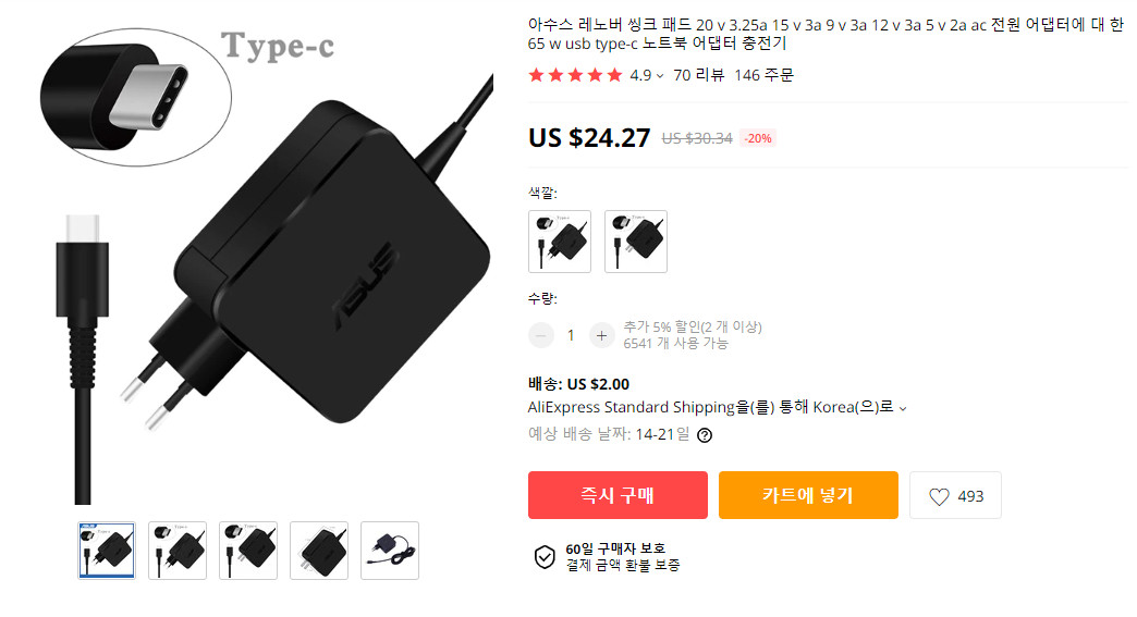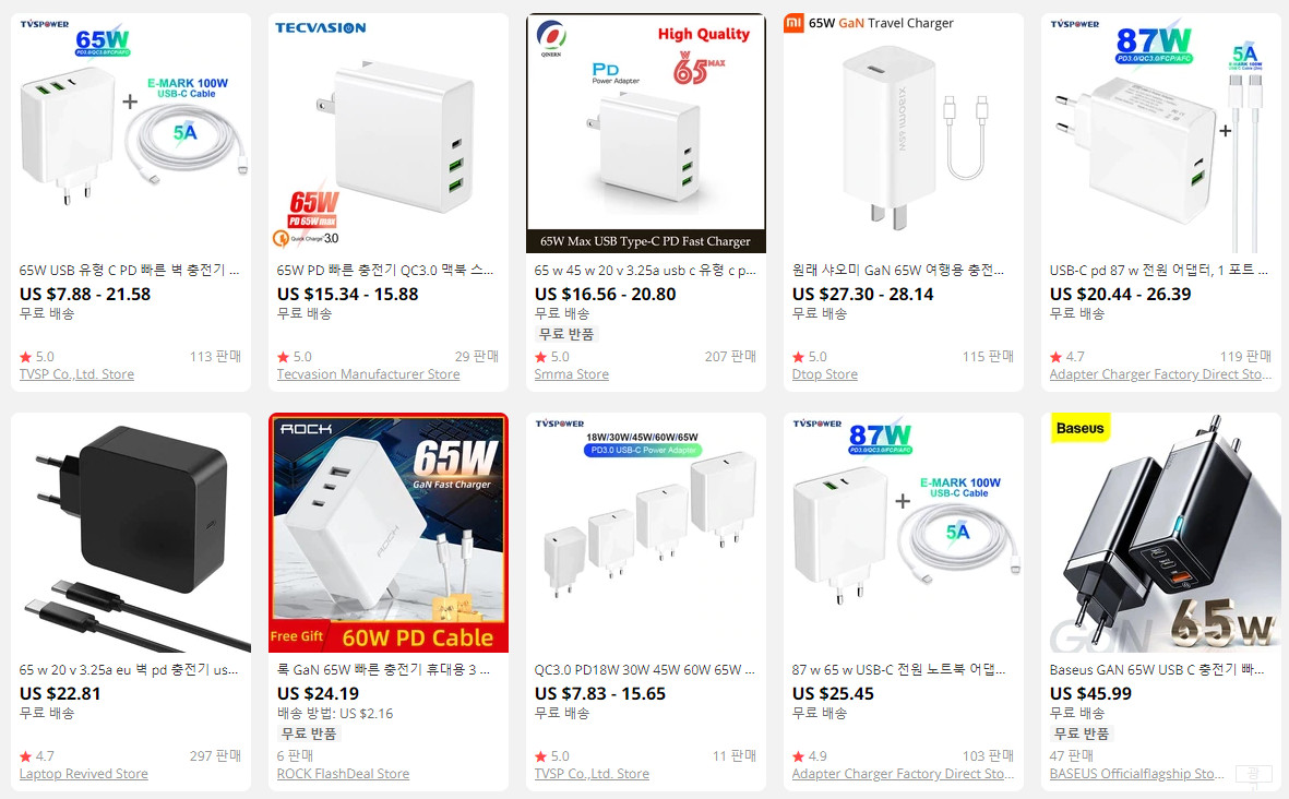 하지만 알리에서 판매하는 PD충전기를 보면 종류도 많고 가격도 저렴합니다. 국내에 거의 없는 65W이상의 멀티 충전기도 판매합니다.