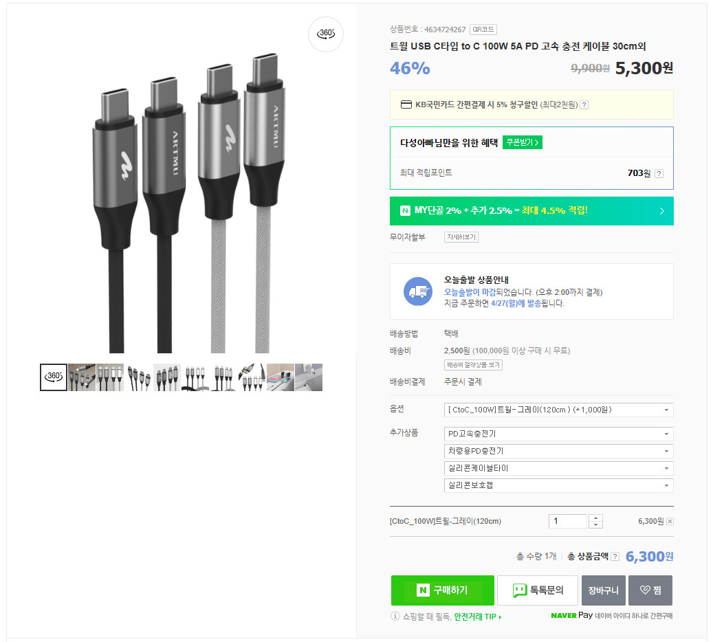 아트뮤에서 나오는 제품으로 네이버 공식 판매점에서 할인 판매하고 있기 때문에 좀 더 저렴하게 구매 가능합니다. 케이블 역시 동일 브랜드에서 100W 5A 고속 케이블 1.2m로 구매했습니다. 2m짜리도 있는데 너무 길면 휴대하기 불편해서 1.2m로 했고, 길이에 따른 비용 차이는 그리 크지 않기 때문에 다양한 환경에서 사용하기에는 2m도 좋다고 생각합니다.