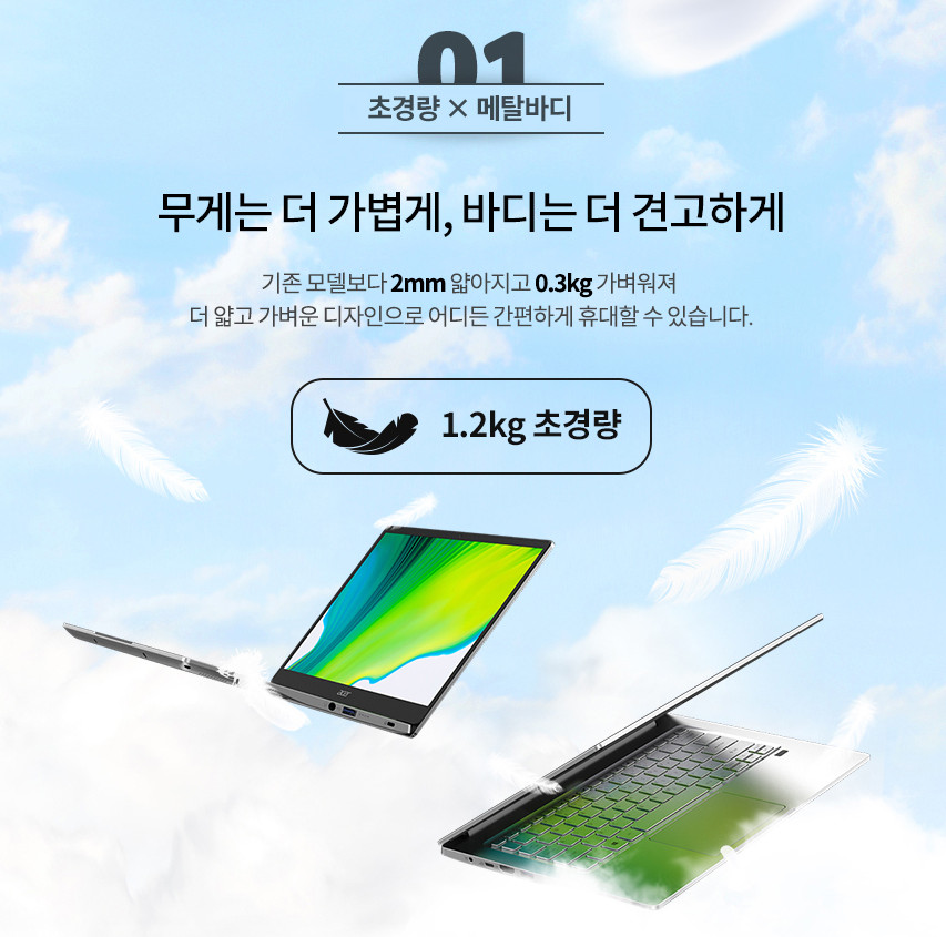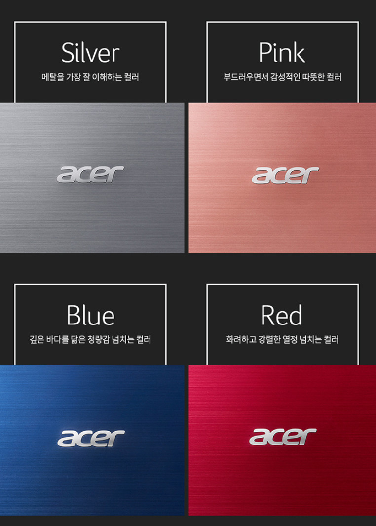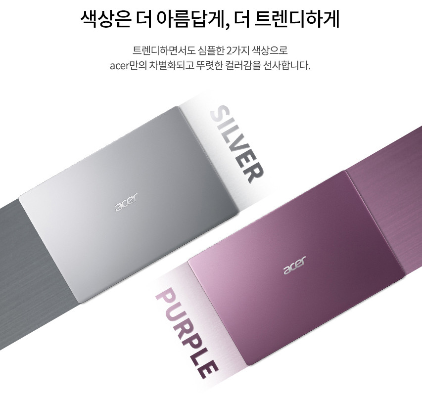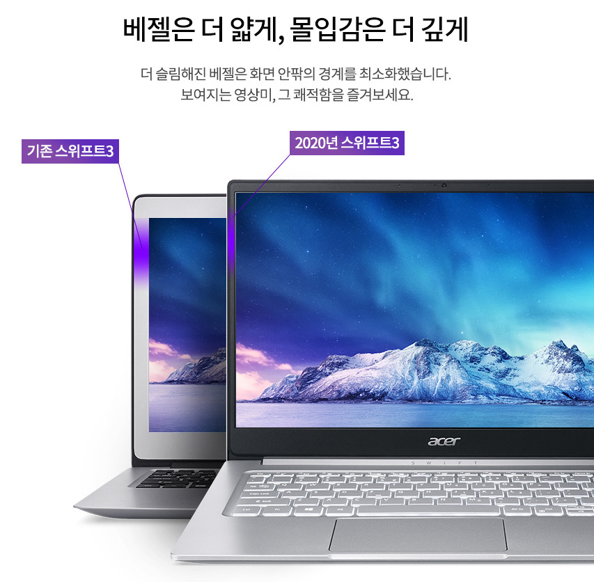 광고에서 꼼수가 많이 보이네요. 노트북을 잘 만들어 놓고 광고에서 왜 이렇게 무리하는지 모르겠어요. 누가 보면 베젤이 전작 대비 굉장히 얇아졌다고 생각하기 쉽겠지만 전작과 거의 비슷한 베젤을 가졌습니다. 지금 비교 대상인 "기존 스위프트3"는 거의 3~4전 구형 모델로 지금은 구할 수도 없는 모델이예요. 비교의 극대화를 위한 장치라고 볼 수 있고 이번에 나온 스위프트3는 전작과 동일하게 좌우 베젤은 충분히 얇지만 하단 베젤은 여전히 두껍습니다. 이 말은 전작 대비 가로 세로 사이즈가 그렇게 줄지 않았다는 거죠. 이번 스위프트3 신형에서 주목해야 할 부분은 단순히 가로 세로 사이즈가 아닌 두께와 무게입니다. 두께와 무게에서 다이어트를 많이 했어요.