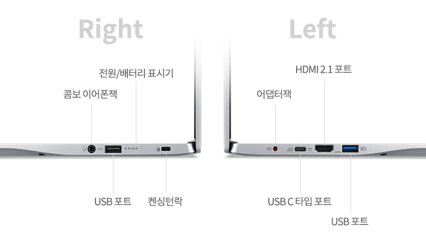 포트 구성은 다소 부족할 수 있으나 전작 대비 가장 큰 변화는 PD충전을 지원한다는 거죠. 휴대성이 좋은 노트북에 높은 사용성이 더해졌습니다. 초당 10GB의 전송속도로 디스플레이 출력 가능하고 여러가지 기능이 있는 PD허브 사용 역시 가능합니다. 반면 SD카드 슬롯이 완전히 빠졌다는 부분은 아쉬운 부분이라고 생각합니다.