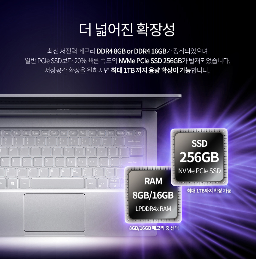 잘 모르는 소비자들은 이 광고를 보고 당연히 "더 넓어진 확장성"이라고 생각하겠지만 절대 그렇지 않습니다. 말도 안되는 카피 문구입니다. 먼저 램은 붙박이에 확장이 불가능합니다. 8GB와 16GB 둘 중 하나를 선택해야 되죠. 그리고 M.2규격의 저장공간 1개만 지원합니다.
