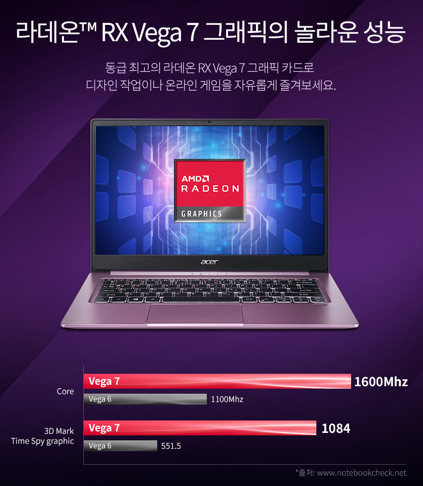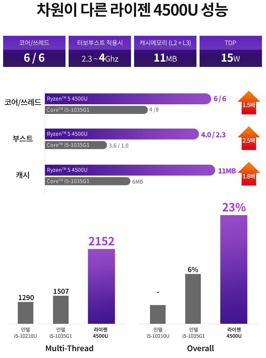 먼저 르느아르 AMD 저전력CPU가 들어갔습니다. 6코어 6스레드 7nm공정의 CPU로 인텔은 더 이상 성능으로 AMD에 비비지 못 할 정도의 차이라고 보면 됩니다. 물론 광고에 꼼수는 보입니다. 비교를 제대로 하려면 i5-1035G4의 인텔CPU와도 비교를 해야 되는데, 그래프의 격차를 늘리기 위해 내장그래픽이 좀 더 부족한 G1 제품으로 비교를 했습니다. 물론 가격을 생각하면 G1 제품이 좀 더 맞을 수 있겠지만 그럼에도 불구하고 그래프를 이용한 광고의 극대화를 위한 꼼수하고 생각됩니다.