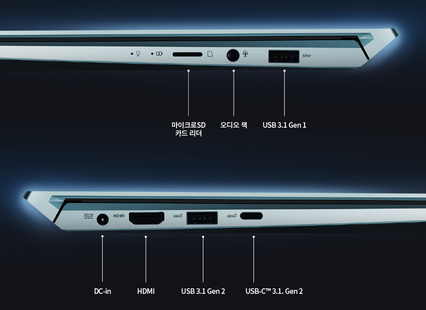150만원 짜리 노트북에 썬더볼트는 물론 PD충전도 지원하지 않습니다. C단자가 있기는 하지만 사용성은 떨어져 보입니다. 저전력 노트북 중에서 이 가격에 썬더볼트가 빠진 노트북은 젠북 듀오 밖에 없을 듯 하고 아무리 듀얼모니터에 집중을 한 노트북이지만 너무 한다는 생각이 듭니다.