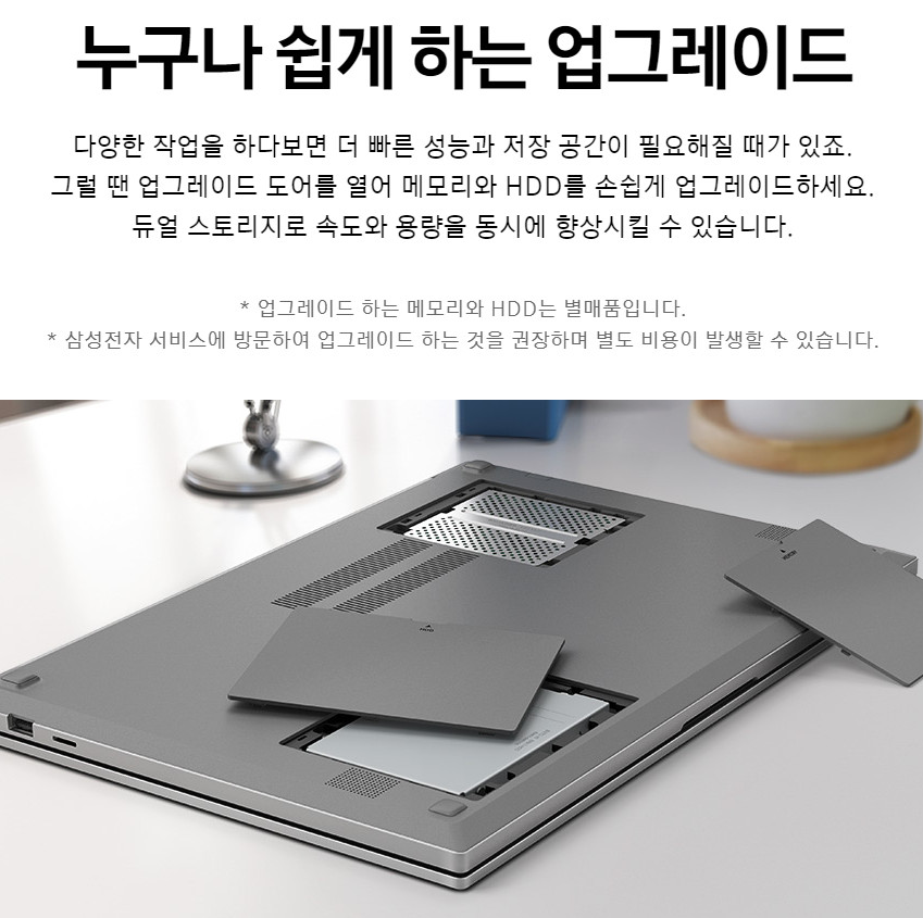 경량화가 되지 않은 구형 노트북에서만 볼 수 있었던, 그리고 지금은 전혀 볼 수 없는, 게이밍 노트북에서 조차 볼 수 없는 시스템이 부활했습니다. 처음에 이 사진을 봤을 때 시대를 역행하는 것으로 생각했는데, 초보자들에게 쉬운 업그레이드 방법을 제시한다는 것으로 접근하면 긍정적으로 볼 수 있겠더라고요. 실제로 초보자들도 쉽게 업그레이드를 할 수 있는 구조입니다. 장점으로 보기도 애매하고 단점으로 보기도 애매하고, 아무튼 옛날 생각나는 구조입니다.