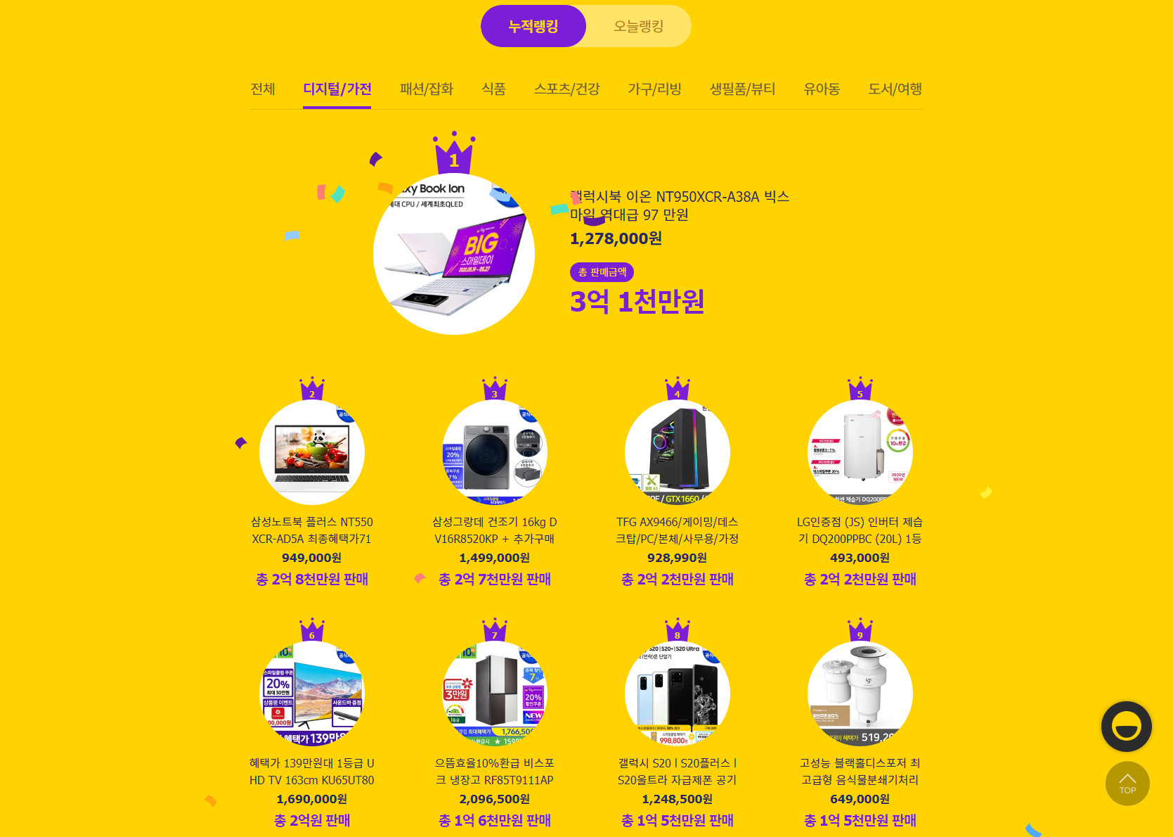디지털/가전 항목에서 이온이 누적랭킹 1위 하고 있는 것은 제가 충분히 이해할 수 있습니다. 저도 리뷰에서 이온 추천을 정말 많이 했는데, 2위에 랭킹 되어있는 삼성노트북 플러스는 제가 전혀 예상하지 못했습니다. 삼성 보급형 라인의 노트북들은 항상 잘 팔려요. 하지만 이정도 일 거라고는 생각하지 못했습니다.
