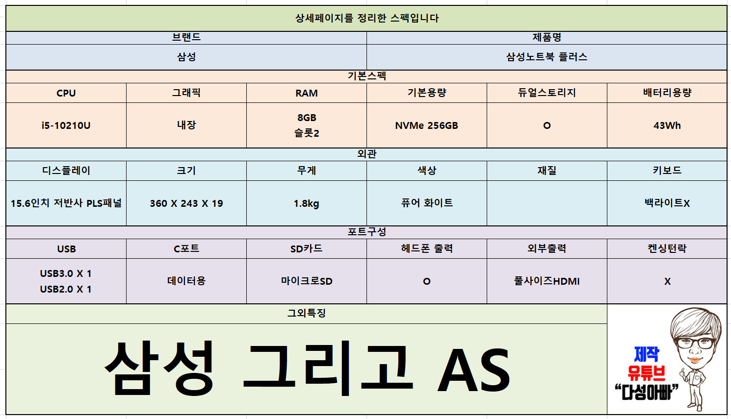 제가 상세페이지를 보고 스펙을 정리했는데, 리뷰 할 것도 없요. 특징이 단 하나도 없습니다.