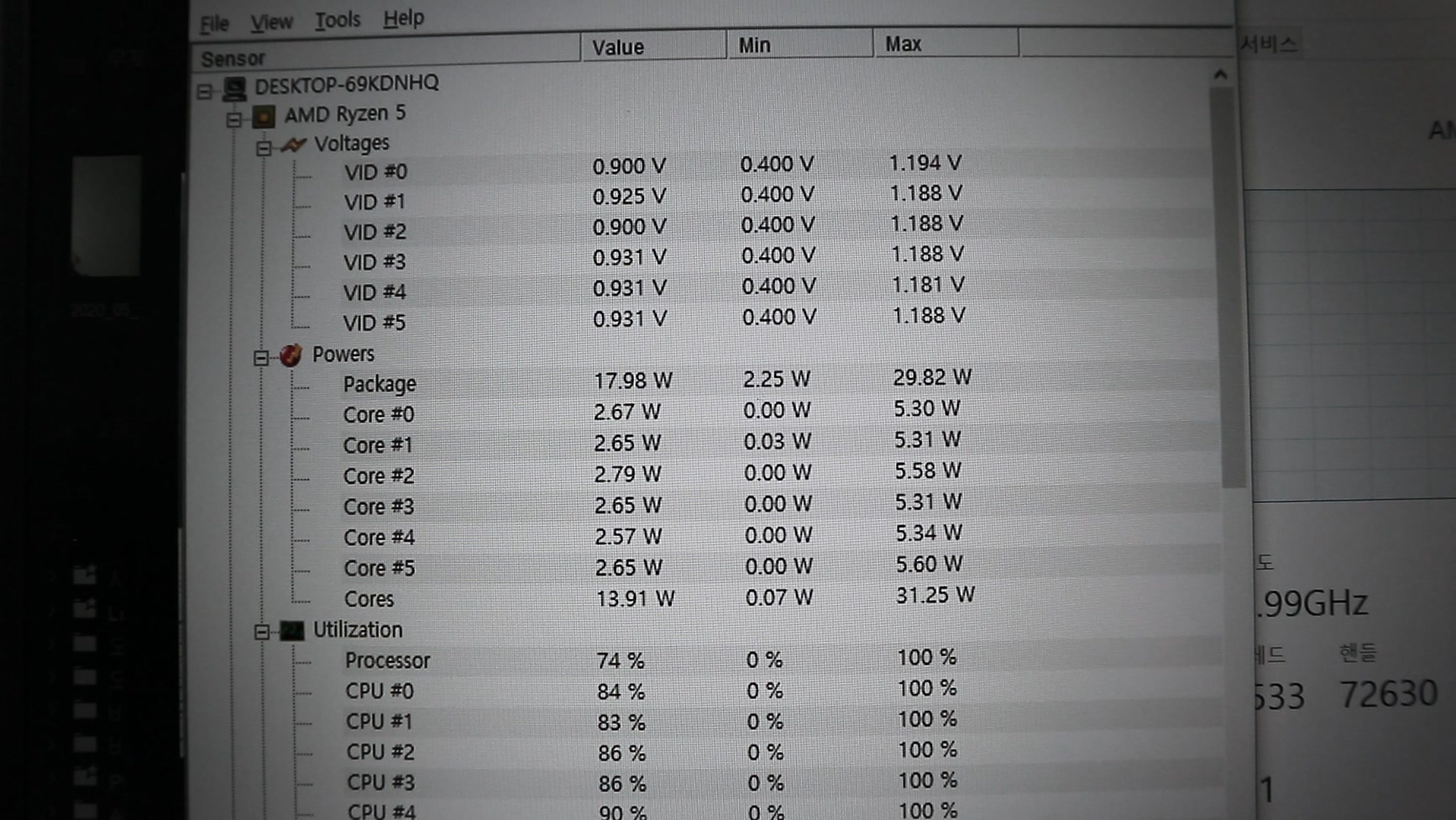 프리미어프로로 인코딩을 하면 CPU는 거의 100%로 사용 된다고 보면 되고, CPU의 순간 최대 전력은 높게 올라기긴 하지만 평균적으로 18W 유지하고 있는 것을 볼 수 있습니다.