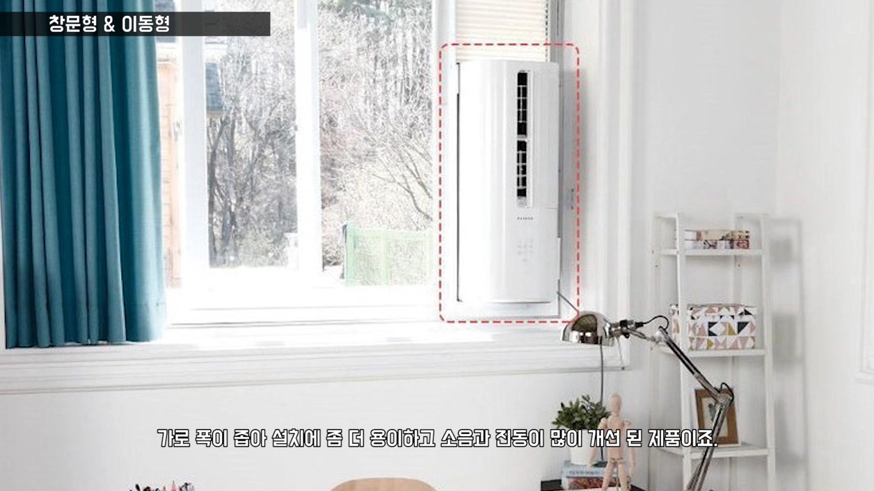 창문형에어컨과 이동식에어컨의 공통적인 특징 : 설치가 쉽다. 내구성이 좋다. 소음이 심하다