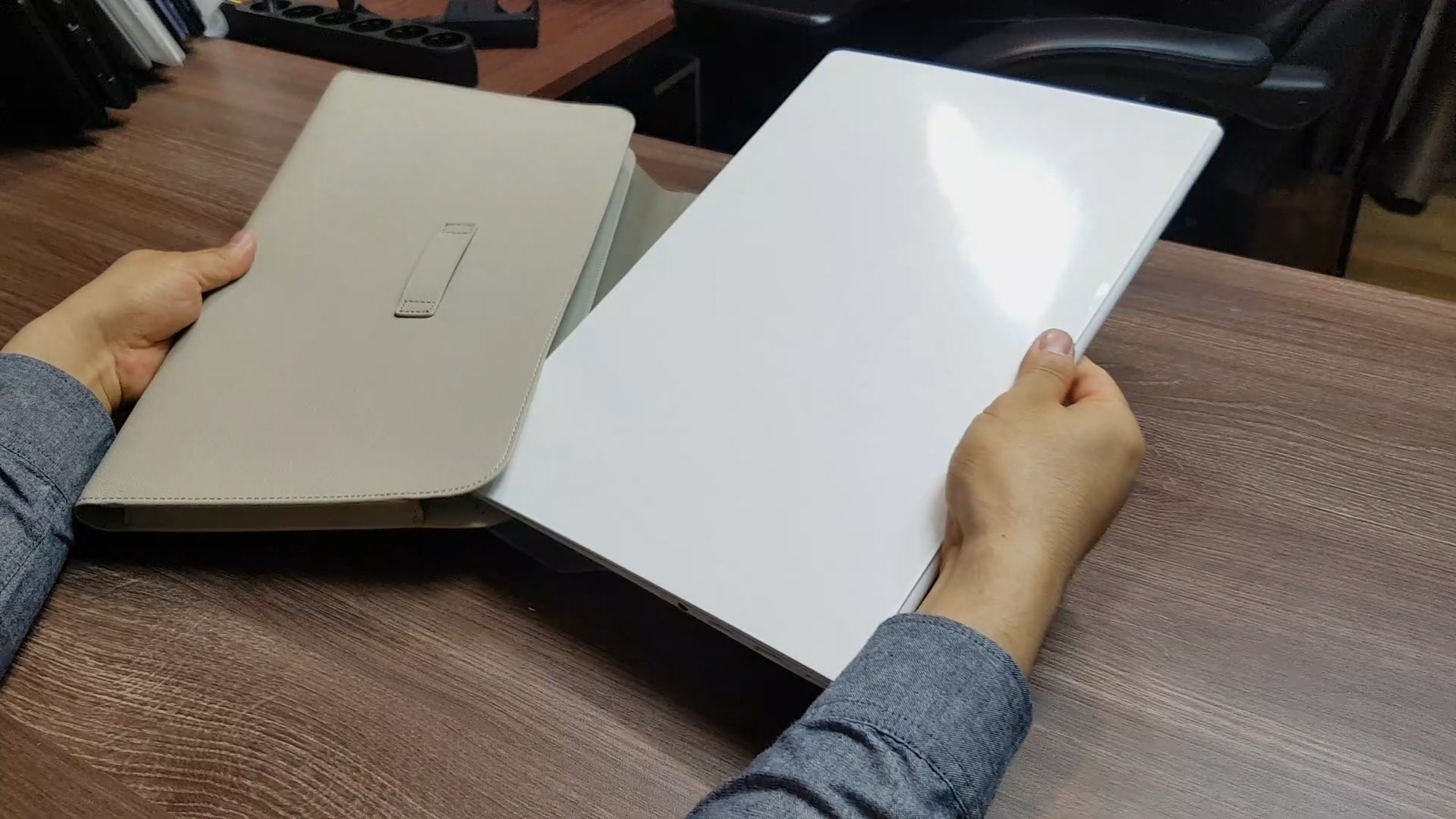 이런 가죽 파우치는 맥북 에어나, 그램, 플랙스, 이온과 같은 슬림한 노트북들이 잘 어울리고 사실 뚱뚱한 노트북에는 잘 맞지 않다고 생각합니다. 그럼에도 불구하고 가죽 파우치를 통해 프리미엄급 휴대성 노트북의 포지션을 지키고 싶다는 욕심을 옆 볼 수 있죠.