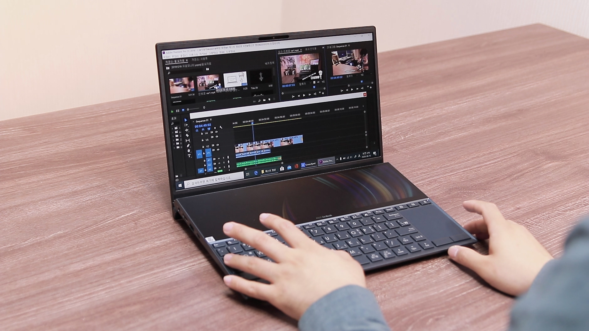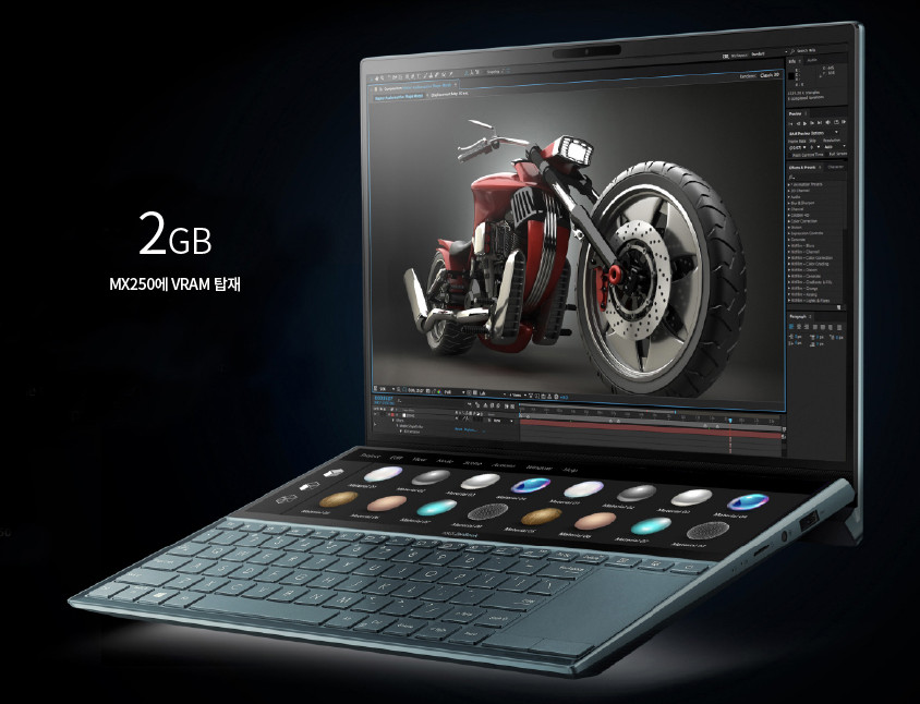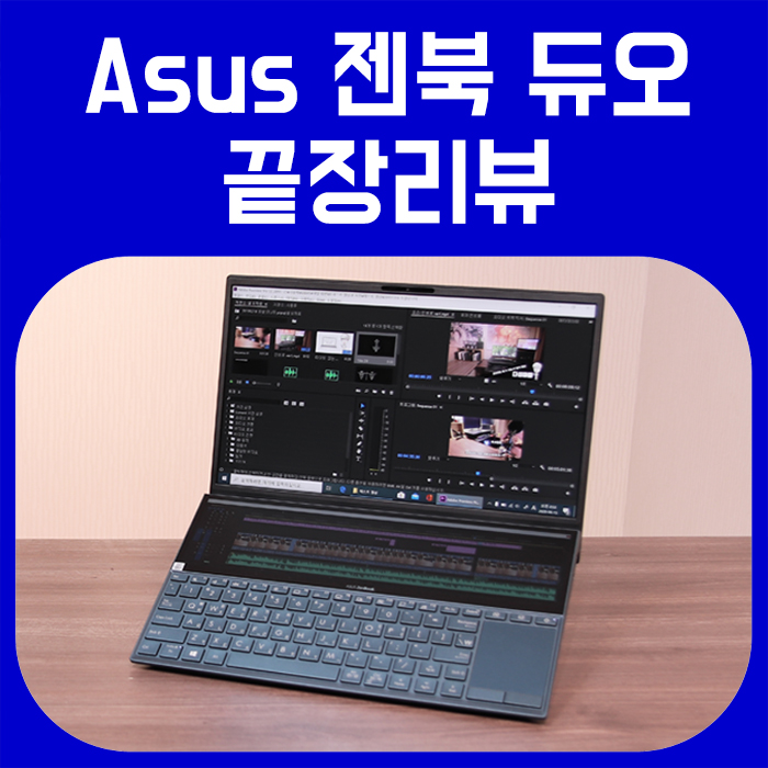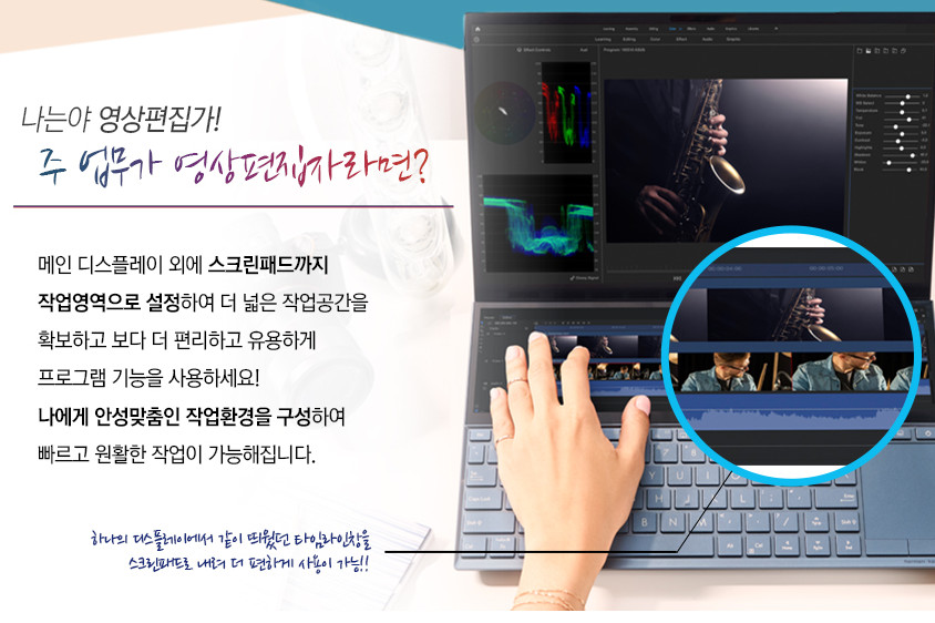 젠북 듀오 광고는 정말 사고 싶게끔 잘 만들어졌어요. 특히 영상편집에 대한 광고 사진이 정말 매력적이죠. 프리미어프로의 타임라인을 보조 디스플레이에 넣고 컷편집을 하거나 펜과 터치를 이용해 직관적인 작업을 하는 모습은 영상편집 하는 사용자라면 매력적이게 보일 수 밖에 없습니다.
