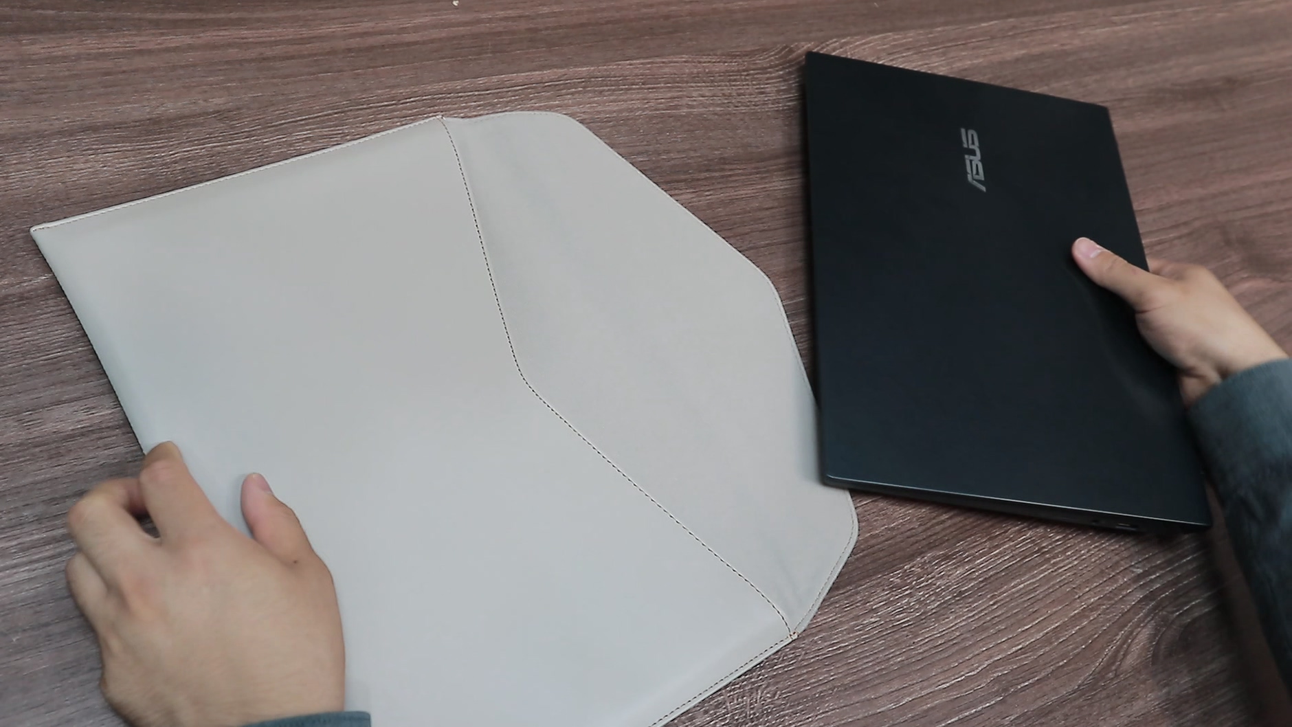이렇게 생긴 가죽 파우치는 슬림한 휴대용 노트북의 상징입니다. 일반적인 노트북 파우치 대비 얇고 고급스러운 대신 잘 늘어나지 않는 성질 때문에 얇은 노트북을 사용했을 때 사용이 편리하죠. 젠북 듀오같이 두꺼운 노트북을 사용하면 넣었을 때 모양도 잘 안 잡히고 면적으로 인한 파우치와의 마찰력 때문에 넣고 빼기도 그렇게 좋지 않습니다.