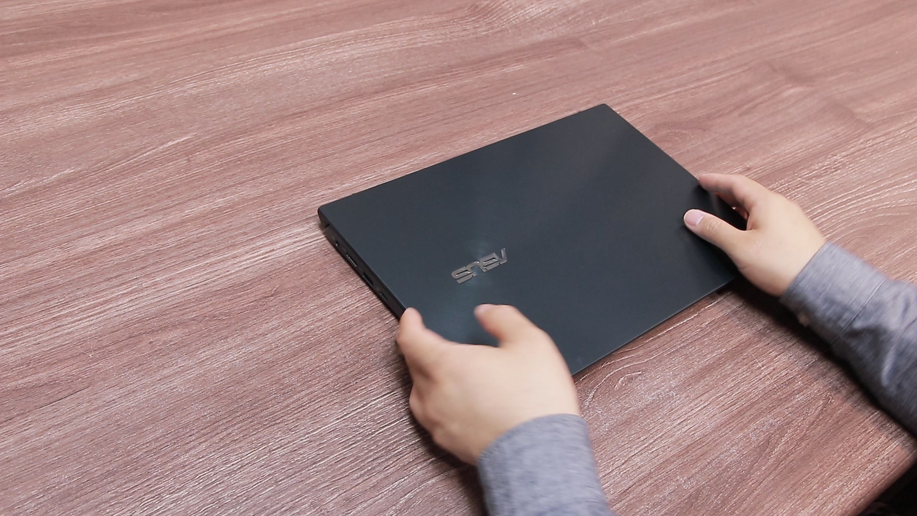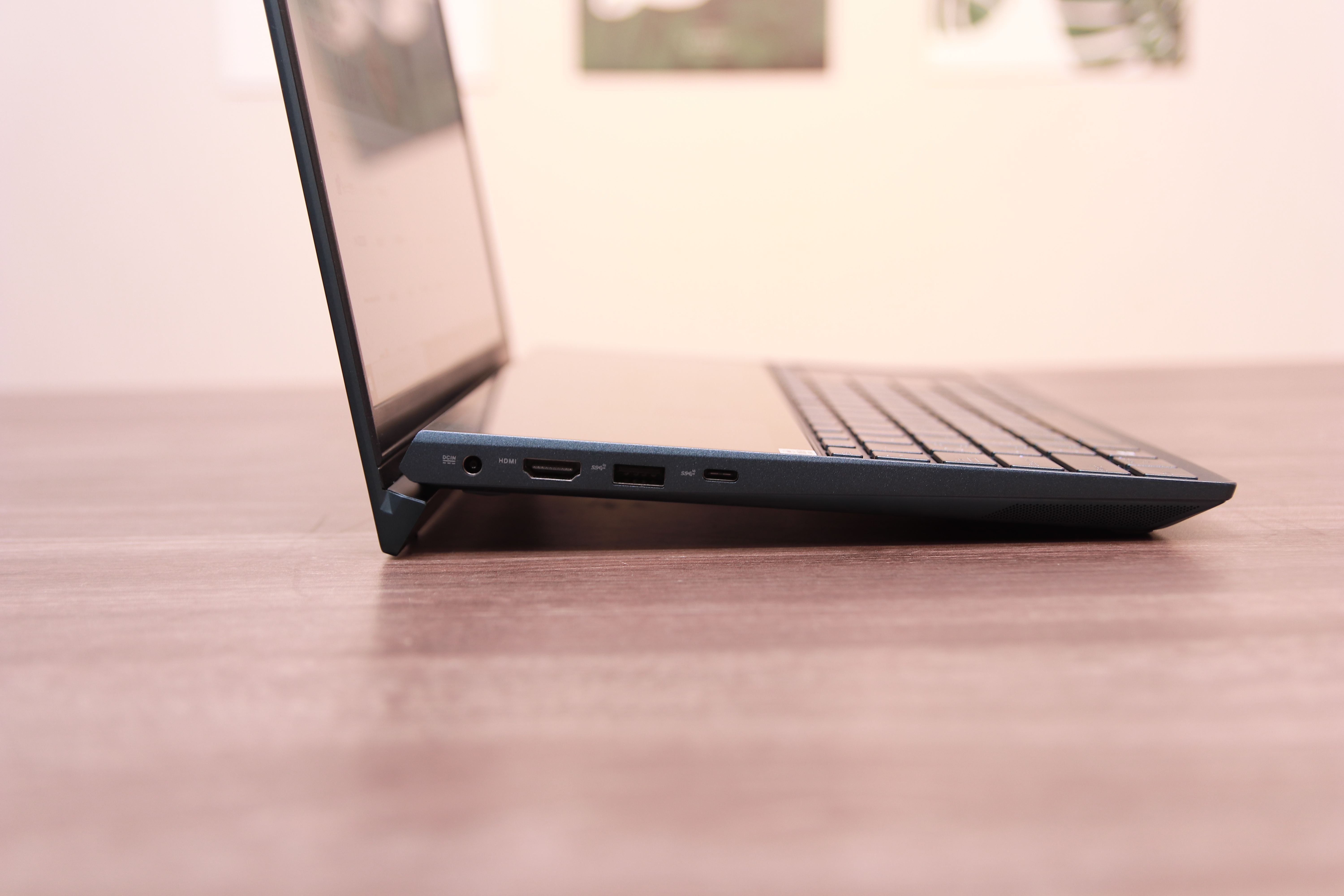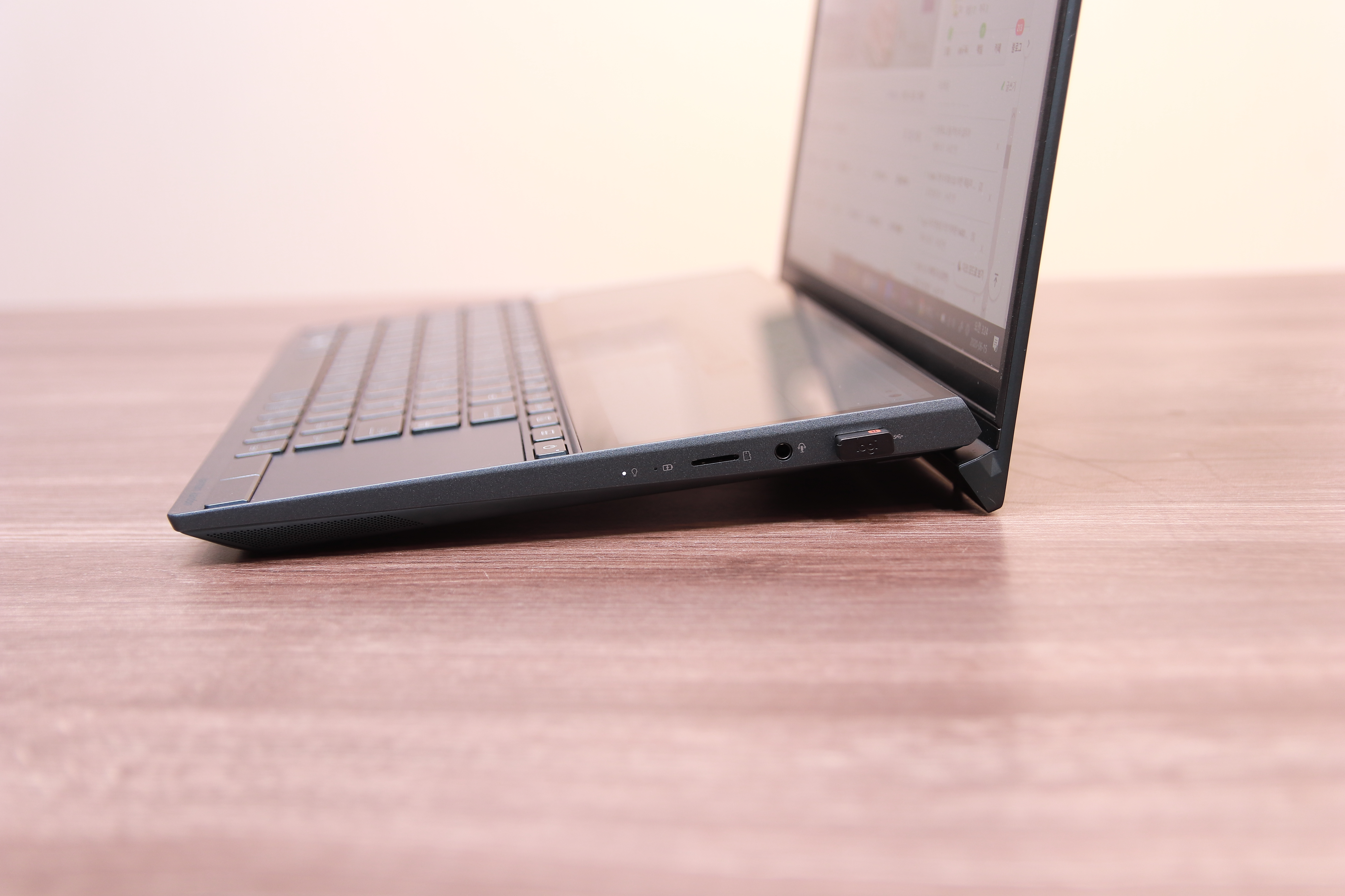포트구성을 간단히 보겠습니다. USB3.1포트 2개, 풀사이즈 HDMI, 이어폰홀, 마이크로SD카드 슬롯, 전원부가 있고, 이 C포트는 데이터만 담당하기 때문에 디스플레이 출력이나 충전은 지원하지 않는 그냥 형색만 갖춘 포트라고 보시면 됩니다. 젠북 듀오 최악의 단점 중 하나죠. 저전력 노특북 중 이 가격에 썬더볼트나 PD충전 지원하지 않는 노트북은 몇 개 되지 않고 실제 사용에서도 계속 아쉬움이 드는 부분입니다.
