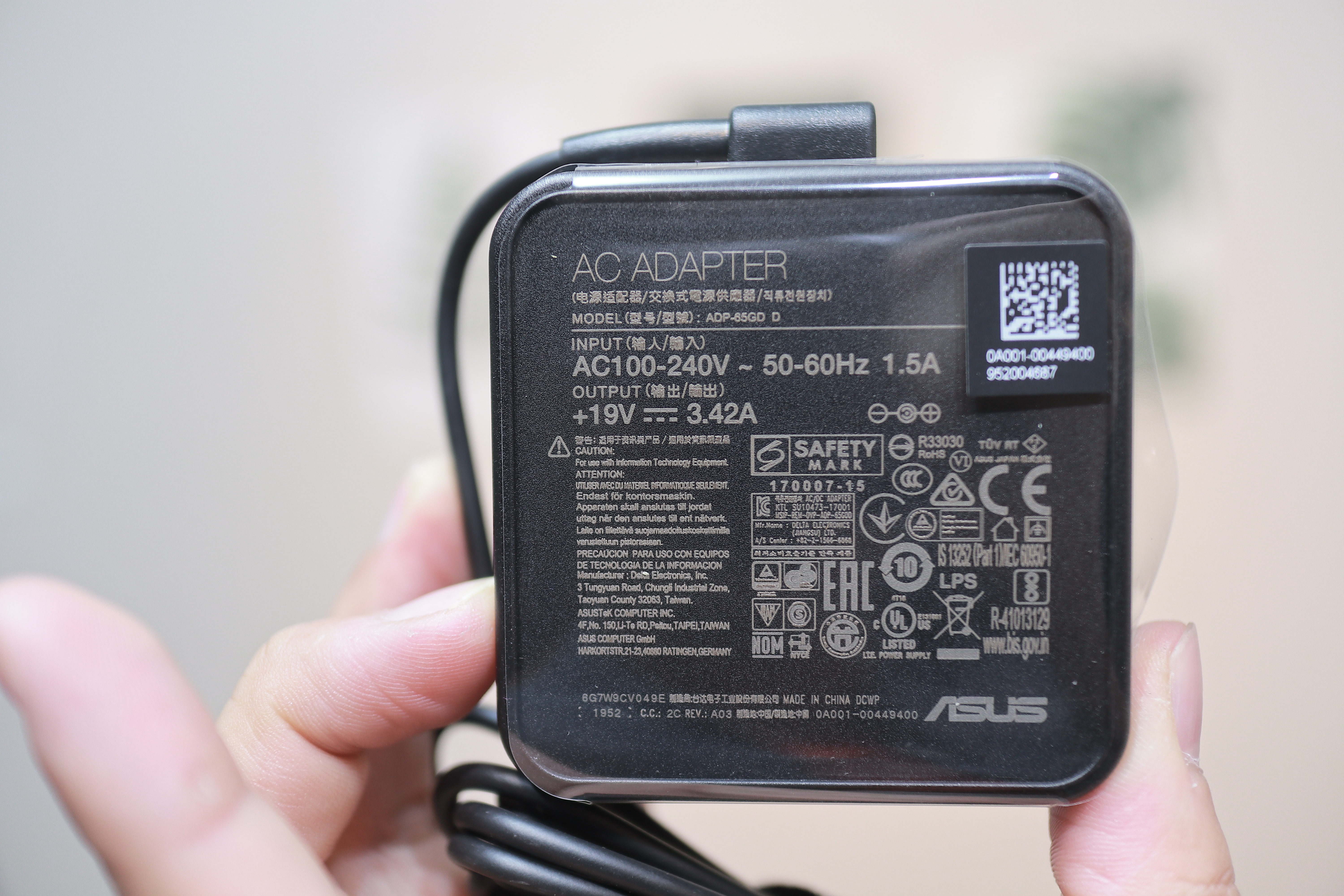 충전기는 65W 접지형 충전기입니다. Asus는 예전부터 충전기 디자인 깔끔하게 잘 만드는 것으로 유명합니다. 일체형은 아니지만 충전기 본체 사이즈가 작아서 휴대가 그나마 좋은 편으로 생각 됩니다. 접지형 충전기 사용으로 사용 할 때 미세전류에 대한 문제는 거의 없었지만, 충전 시 상판 알루미늄에 간헐적으로 미세전류가 느껴졌습니다. 불편한 정도는 절대 아닙니다.