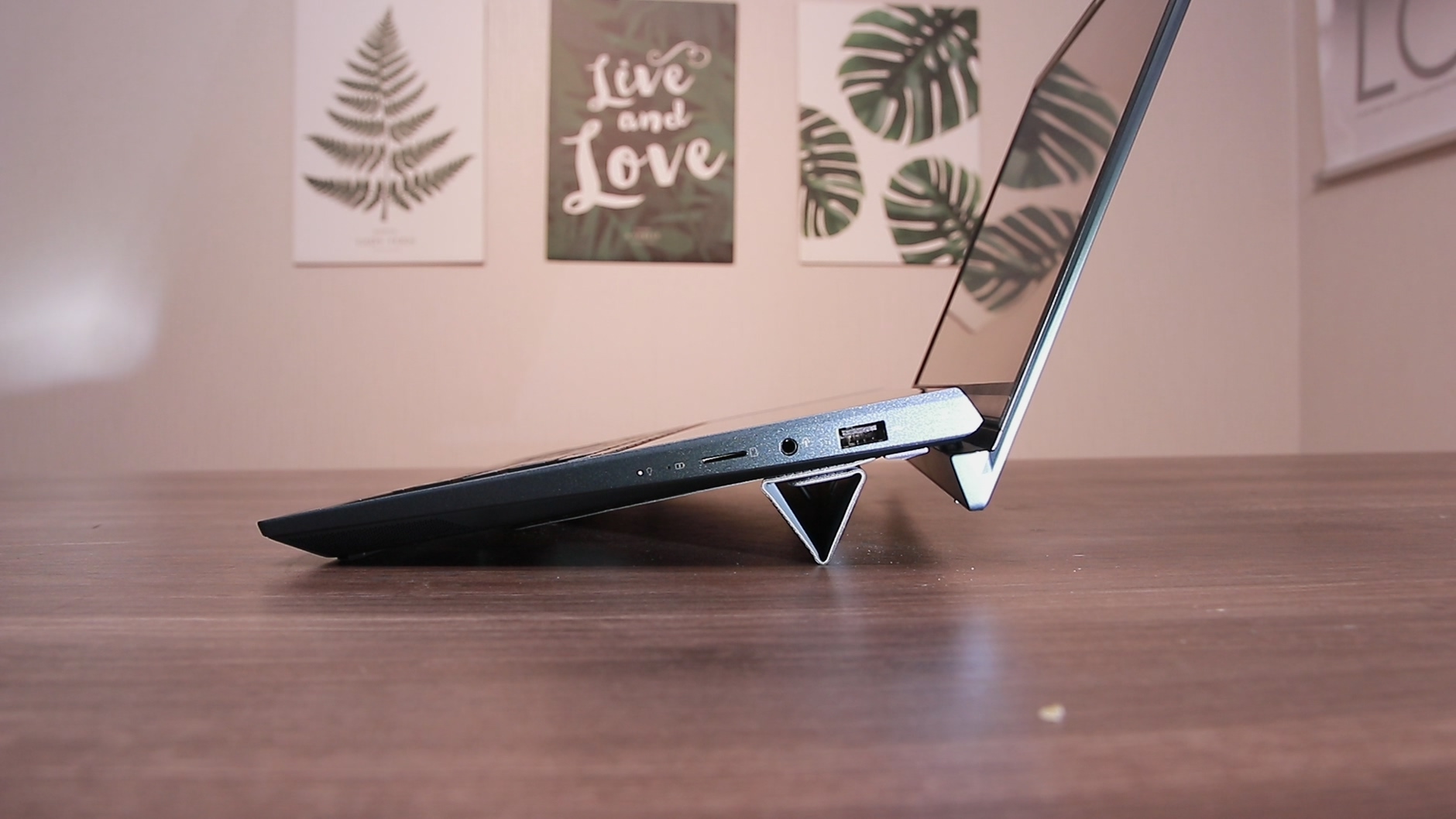 다른 노트북들의 에르고리프트 각도가 2~3도인 것에 비해 젠북 듀오는 5.5도로 굉장히 높이 리프트 됩니다. 일반적으로 알고있는 에르고리프트의 장점을 위해서가 아닌 "보조 디스플레이의 각도" 때문이죠.