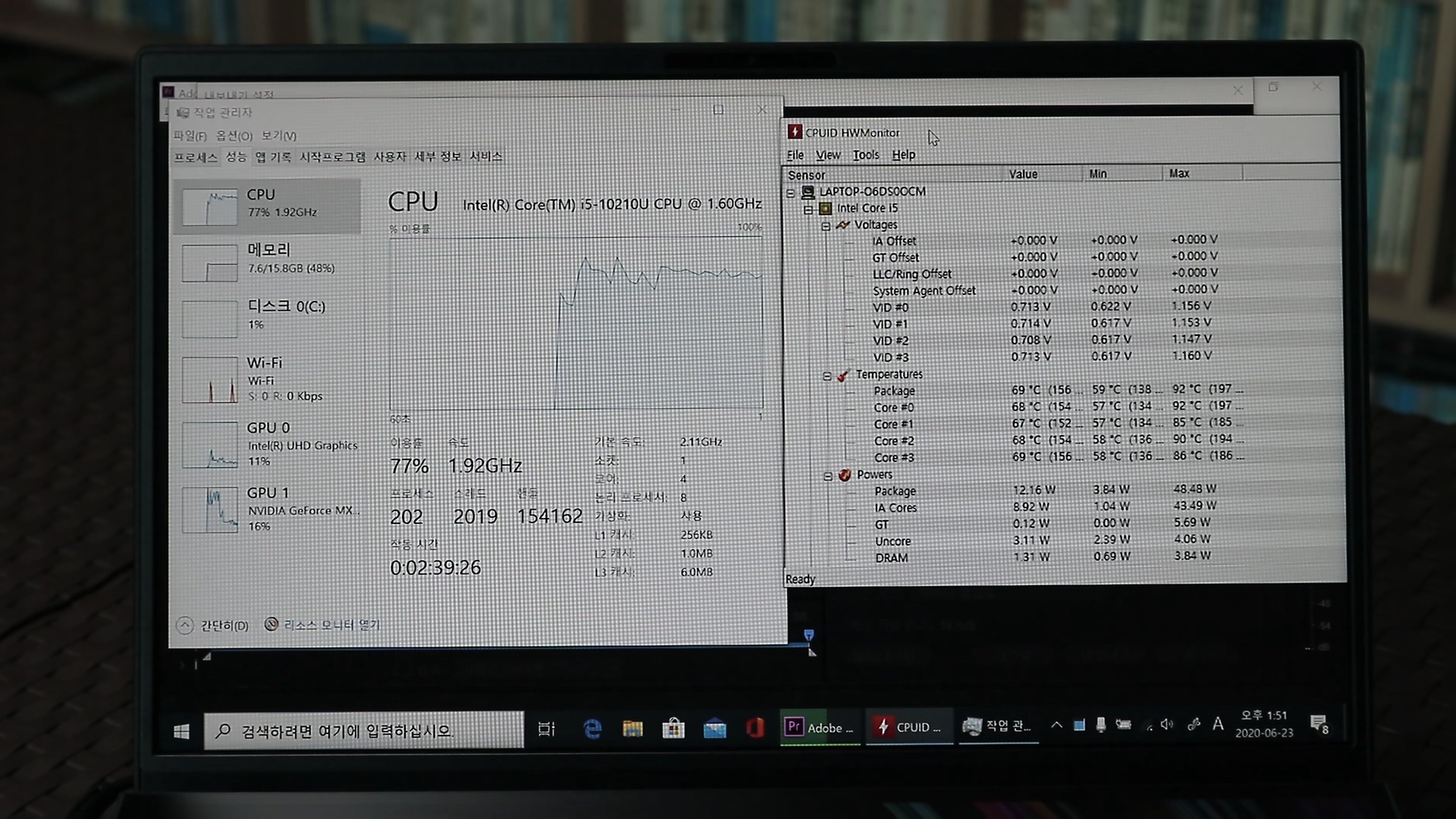 영상편집 할 때의 발열은 꽤 안정적이며 팬 소음 역시 전반적으로 조용합니다. 영상 인코딩 할 때 팬 소음이 들리긴 하지만 귀에 거슬리는 수준은 아니고, CPU는 80%의 사용량을 넘기지 않고, 온도는 70도 정도로 안정적인 모습을 보여주고 있습니다. 역시 고성능 작업에서 듀얼 팬, 듀얼 히트파이프의 장점이 나타나고 있네요. 좀 더 무리한 작업을 하더라도 노트북 자체에 부담을 크게 주지 않고 저전력 CPU 기반이지만 작업용 노트북으로써 아주 좋은 모습을 보여주고 있습니다.