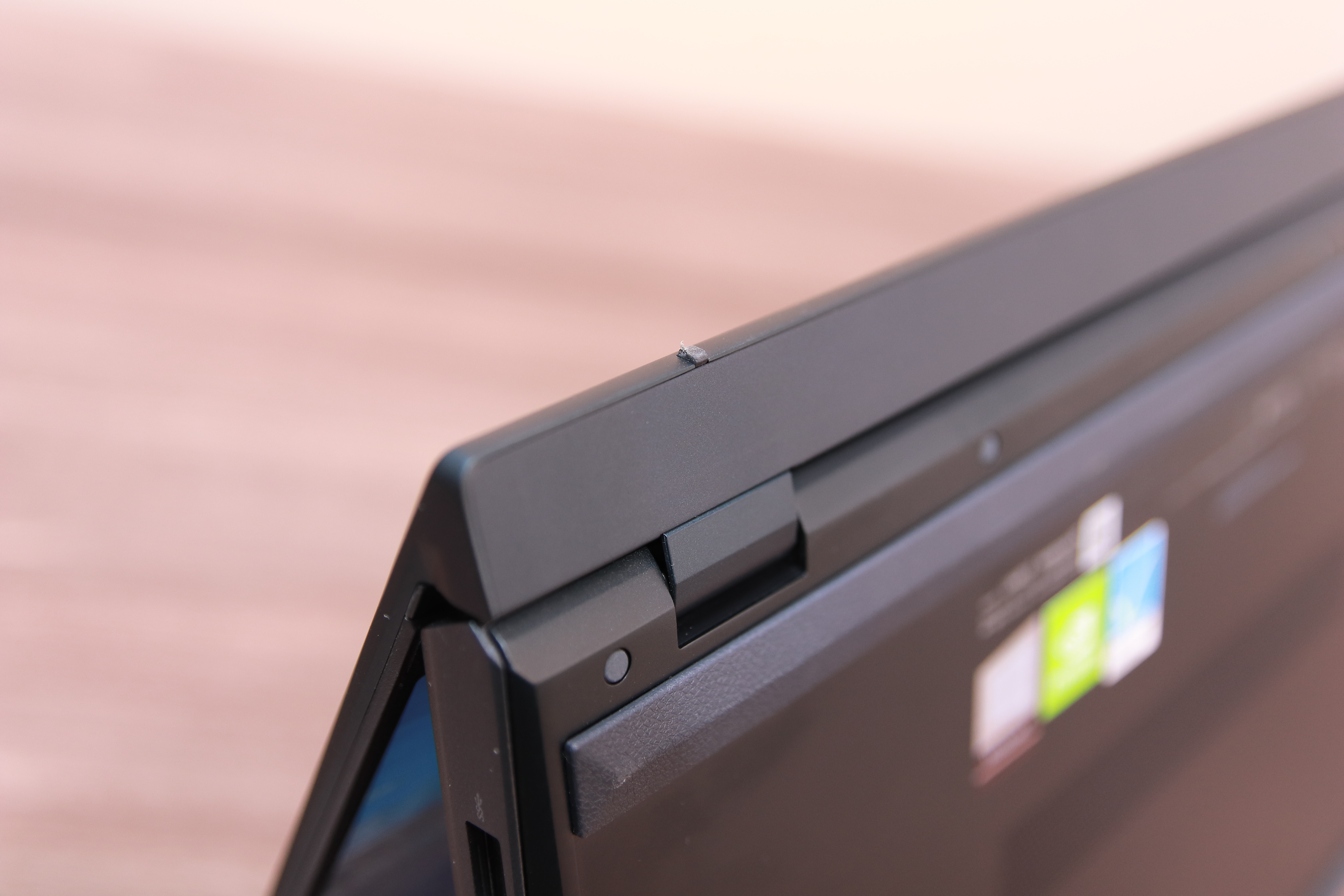 에르고리프트 힌지를 지원하기 때문에 실제로 바닥에 닿는 모서리 부분의 고무가 중요합니다. 고무가 작은 만큼 마찰력이 그렇게 높지 않고 노트북이 조금씩 밀리는 모습을 보입니다. 하판의 고무나 힌지부분의 고무 모두 마찰력이 그렇게 높기 않기 때문에 고정력 자체는 좋지 않습니다. 에르고리프트 힌지 부분을 좀 더 살펴보겠습니다.