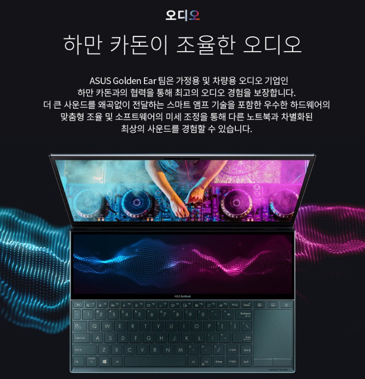 사운드 아주 좋습니다. 특별하지는 않지만 평균이상은 됩니다. 하만 카돈이 조율한 오디오라고 광고하고 있는데, 사실 광고만 이렇게 하고 막상 들어보면 2W짜리 평범한 노트북용 스피커인 경우가 많아요. 그런데 젠북 듀오 사운드는 좀 더 깨끗하고 또렷한 음향을 들려주고 있습니다. 물론 출력자체가 높지는 않습니다. 하지만 일반적인 음악 감상, 영화감상, 영상작업용으로 사용할 때 충분한 사운드를 들려줍니다.