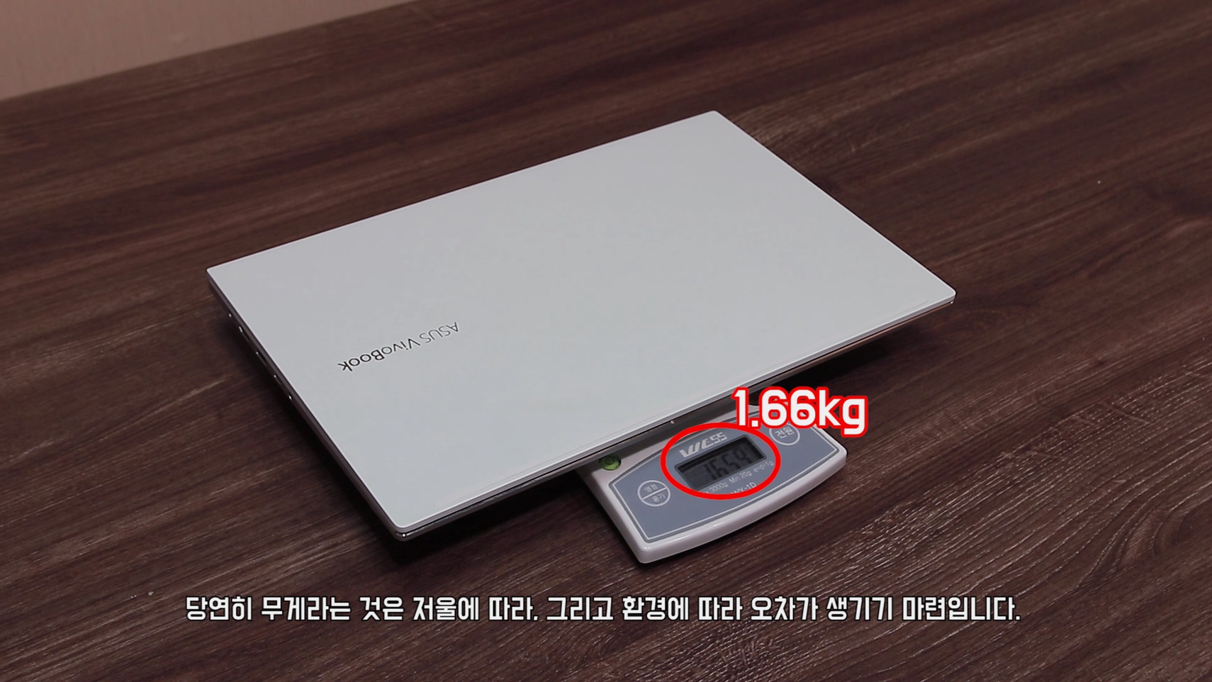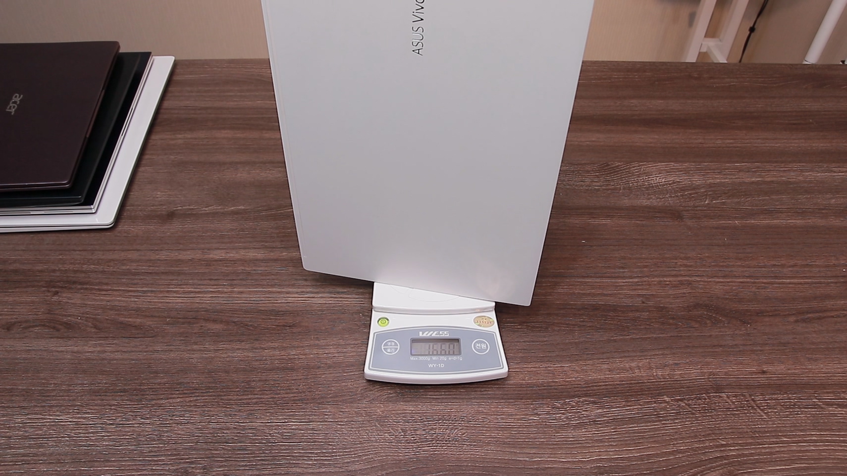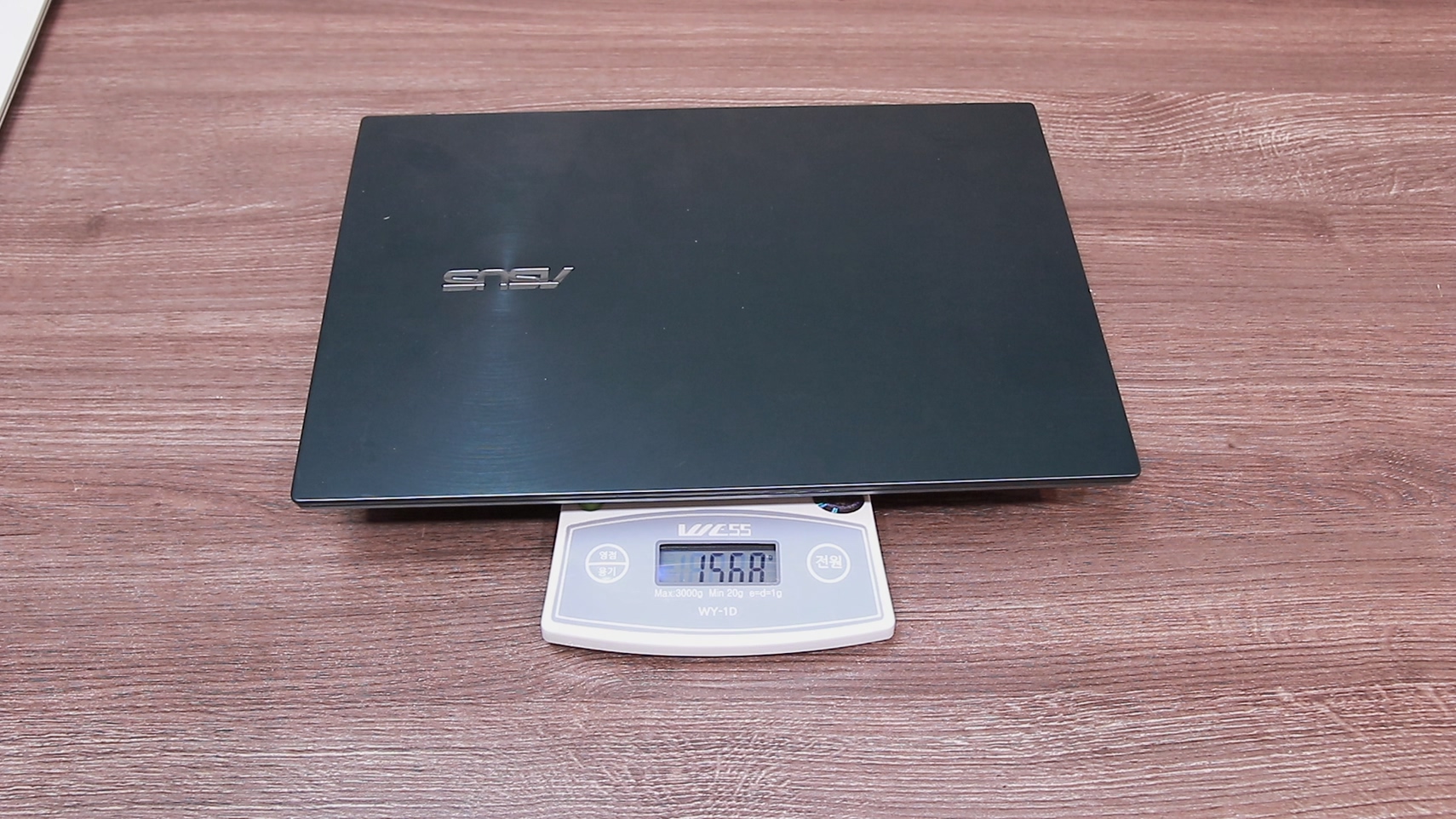 그렇다면 이 저울을 의심할 수밖에 없습니다. 그래서 제가 최근에 리뷰했던 노트북의 무게를 같이 재 봤습니다.
