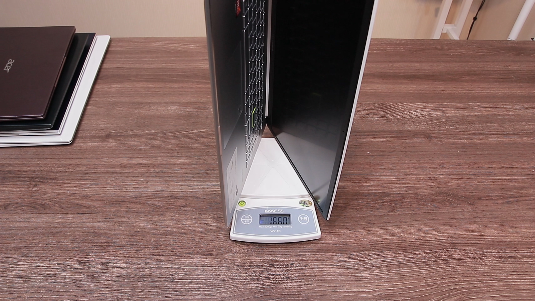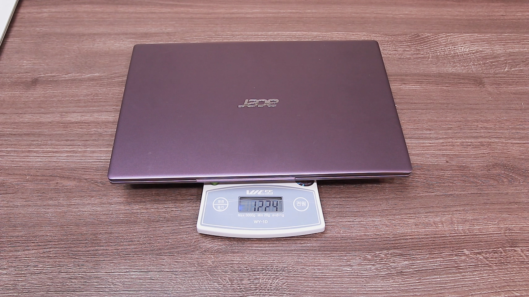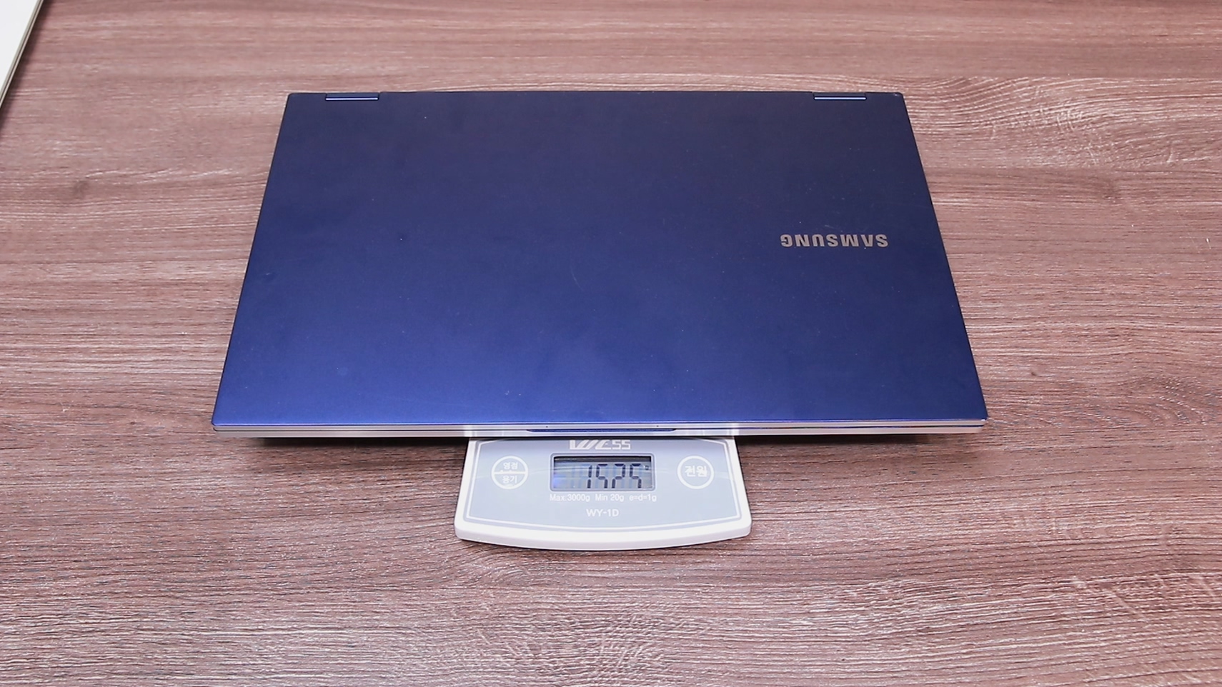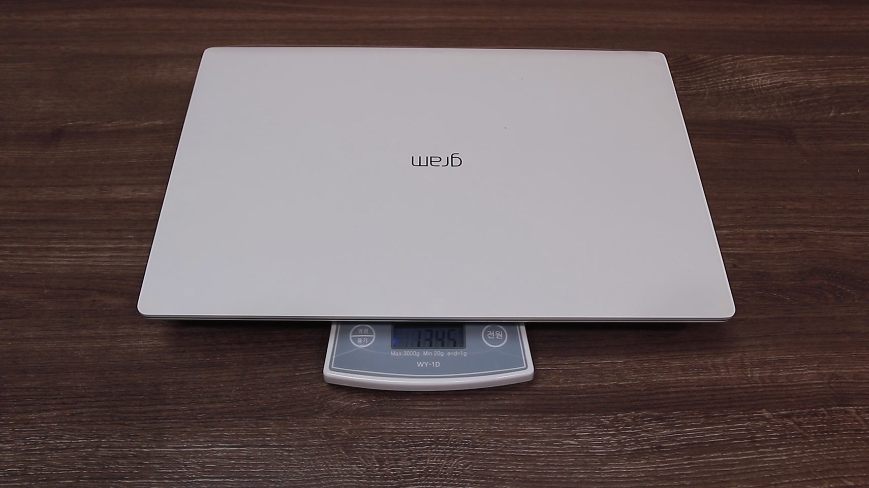그렇다면 이 저울을 의심할 수밖에 없습니다. 그래서 제가 최근에 리뷰했던 노트북의 무게를 같이 재 봤습니다.