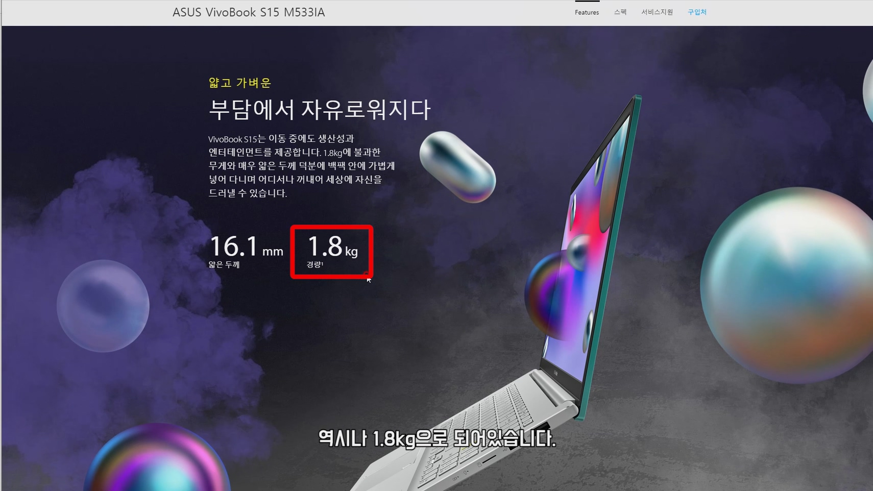 혹시 몰라 공식 홈페이지에도 들어가 확인했습니다. 역시나 1.8kg으로 되어있습니다.
