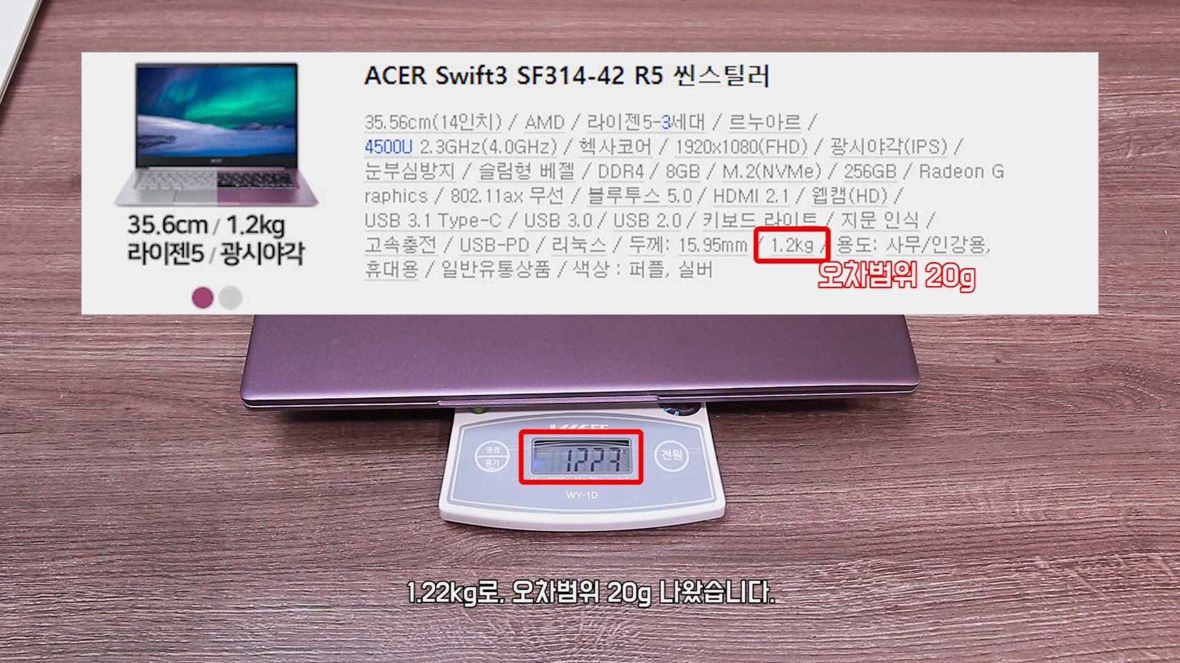 가장 최근에 리뷰한 Acer 스위프트3는 1.22kg로, 오차범위 20g 나왔습니다.