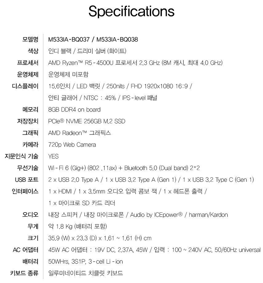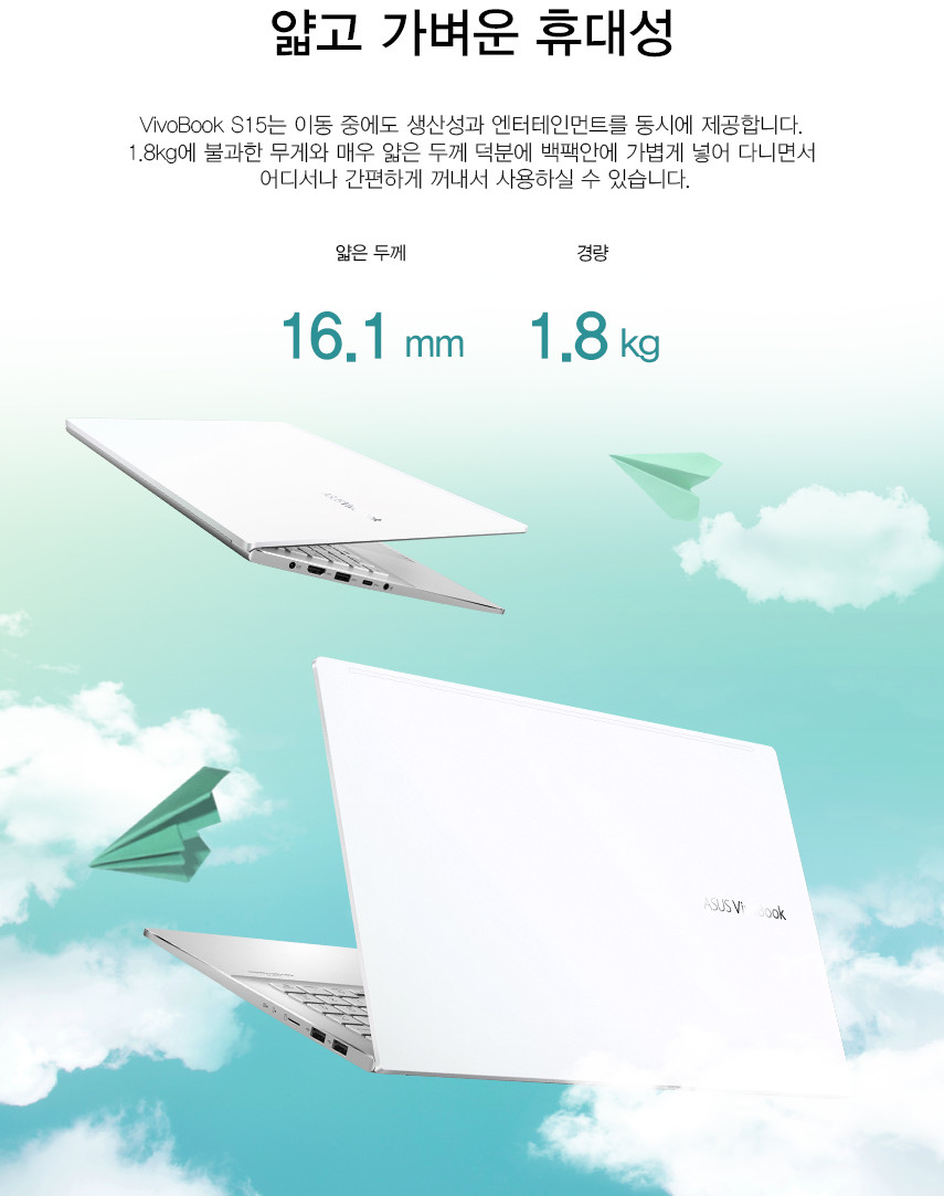 제가 구매한 비보북S15 M533IA의 무게는 상세페이지에 1.8kg이라고 표기되어 있습니다. 15.6인치 기준이죠.