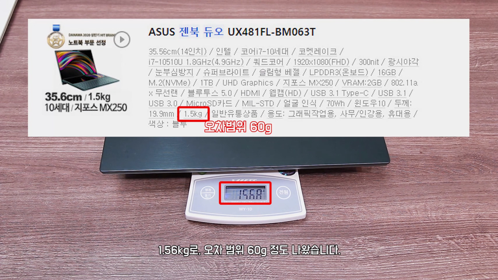 Asus 젠북 듀오는 1.56kg로, 오차 범위 60g 정도 나왔습니다.