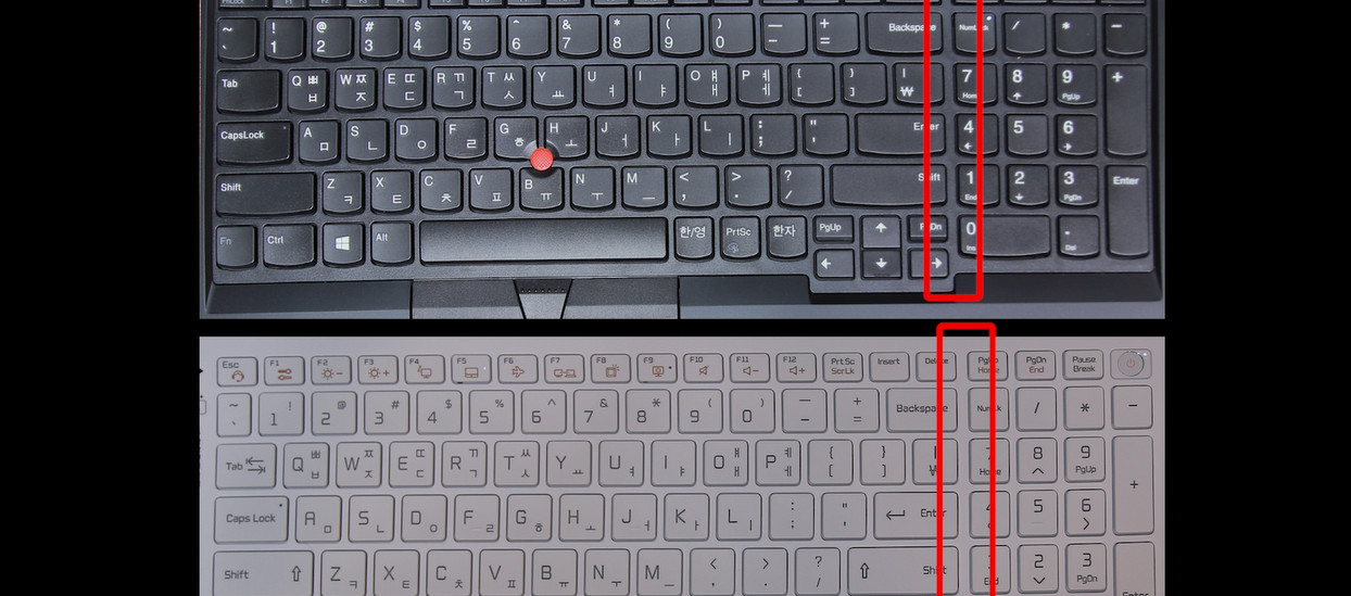 그래서 씽크패드와 그램17은 이 사이를 아주 살짝 띄웁니다. 이렇게 살짝만 띄어도 손끝의 감각으로 숫자패드의 위치를 파악할 수 있고 확실히 오타율을 낮출 수 있죠. 사소한 부분이지만 굉장히 영리한 방법이고, 소비자를 생각하는 키보드 레이아웃이라고 볼 수 있습니다.